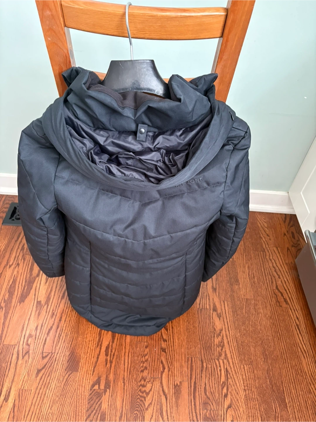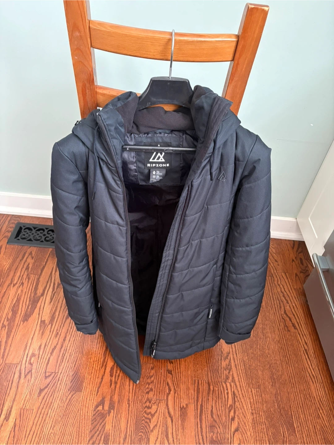 76Here's a Ripzone puffer jacket in black. It's in great condition and ready to keep you warm this season.