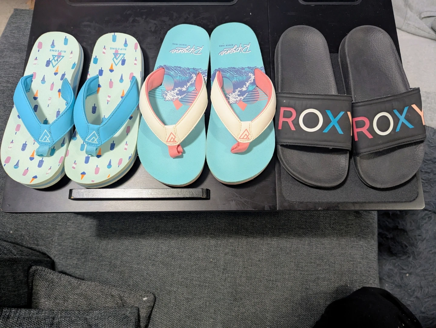65Selling a couple pairs of flip flops! There's a pair of Ripzone flip flops with a light blue popsicle pattern and another pair of Ripzone flip flops in light blue. Also included is a pair of black Roxy slides with the brand name in colourful letters. Both pairs of Ripzone are new and have never been worn and the Roxy ones are close to like new condition. Only worn a couple times. All included for the 1 price.