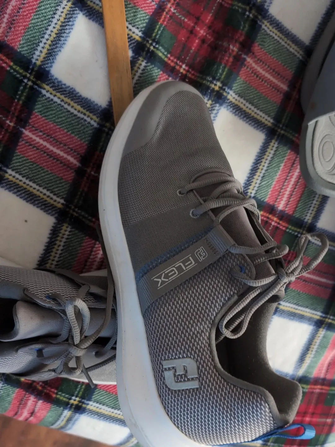 These are FootJoy FJ Flex golf shoes in grey. They feature a mesh upper for breathability. The shoes offer comfort and flexibility for the golf course.