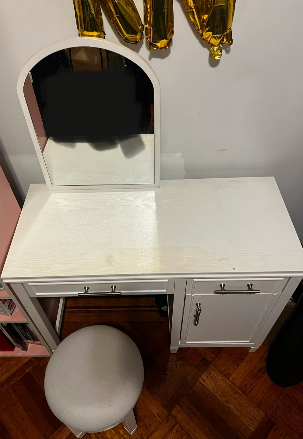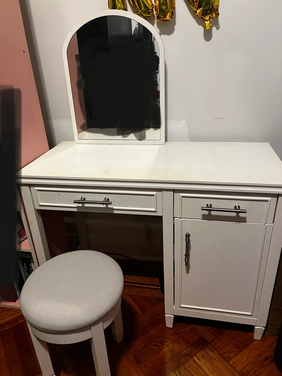 White vanity desk with a matching stool and arched mirror. Features two drawers and a cabinet for storage. This set is perfect for a bedroom or dressing area.