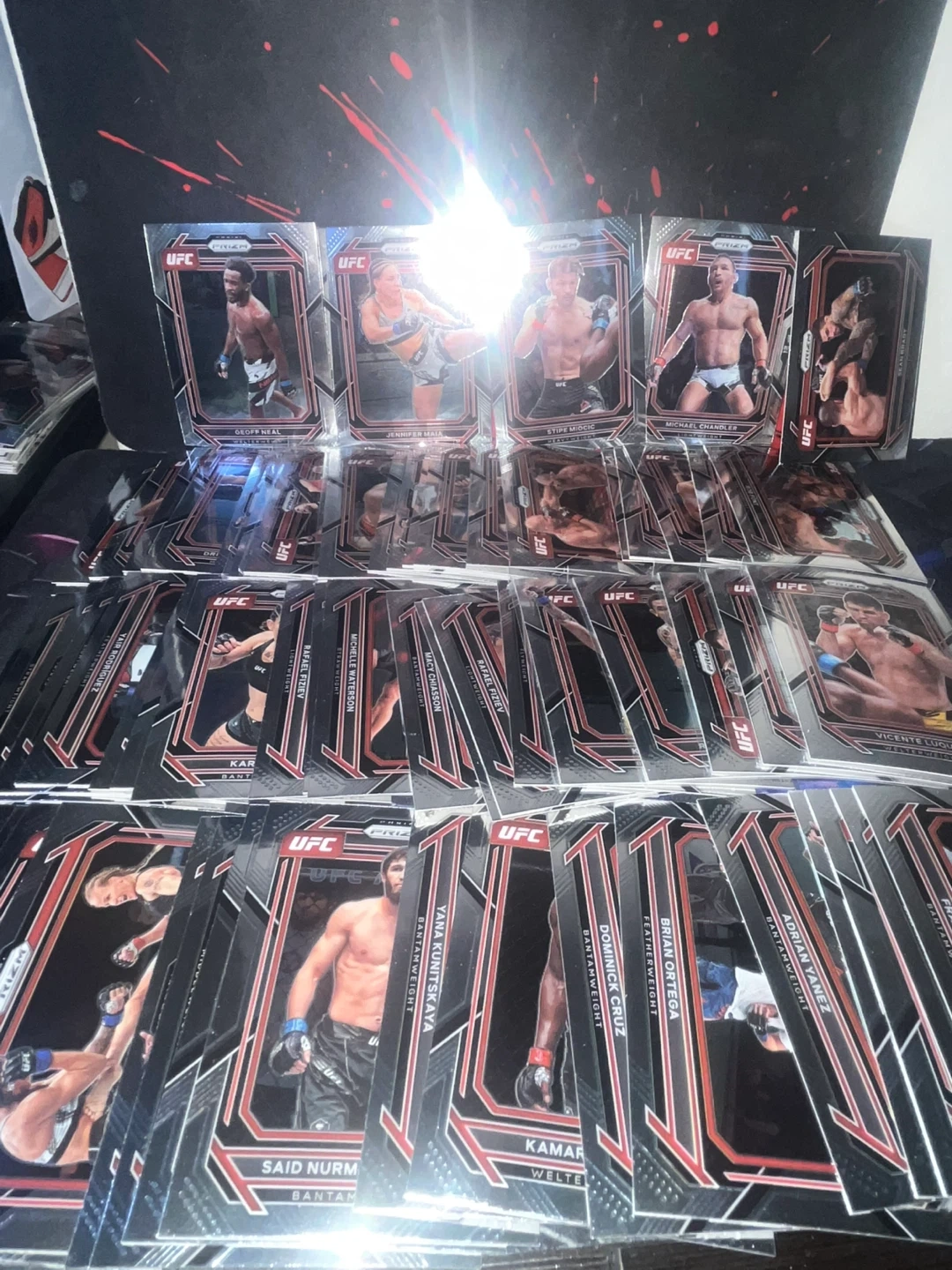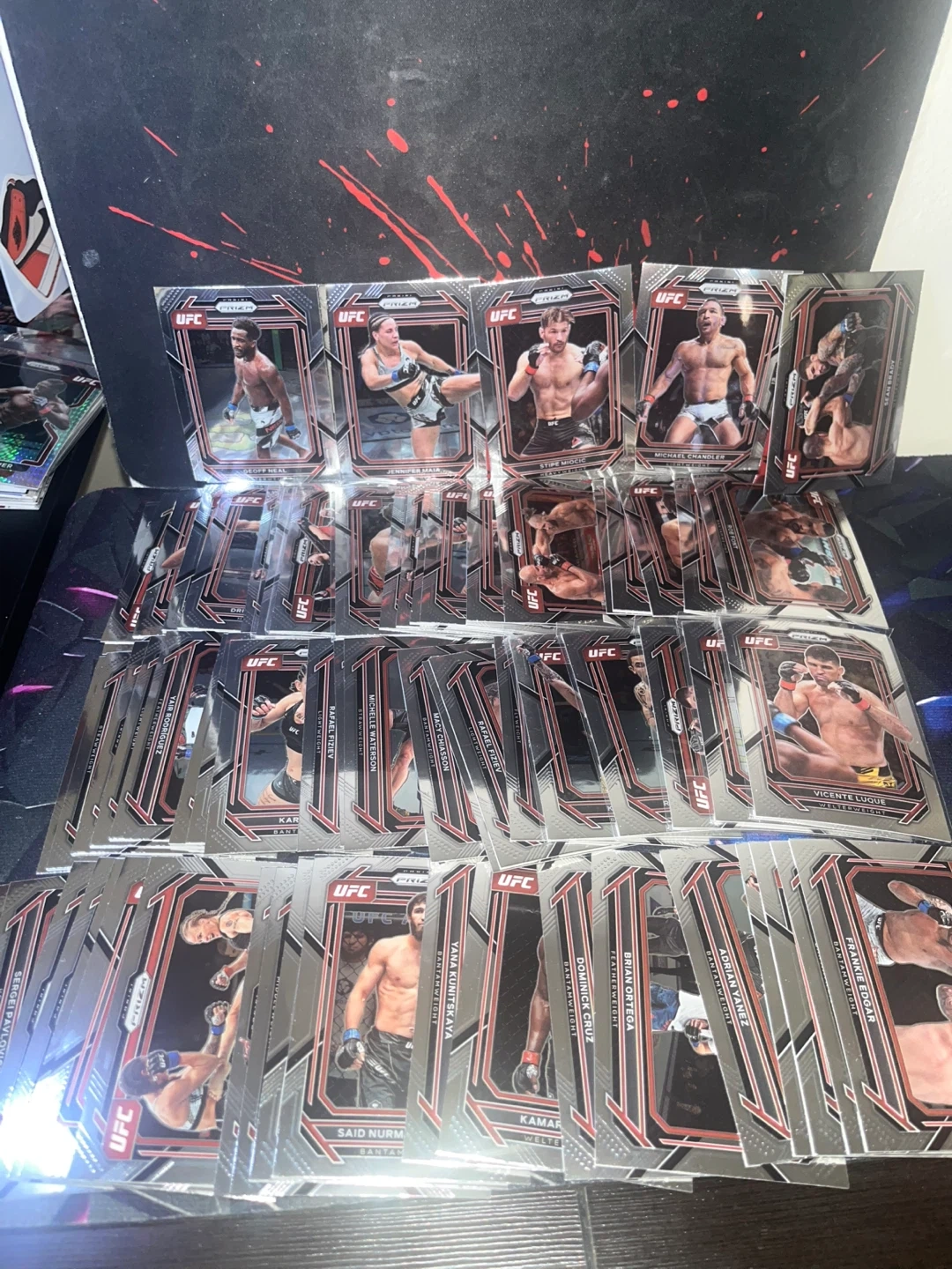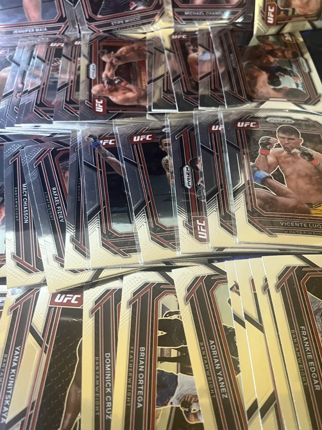 A collection of 2022-2023UFC Prizm trading cards featuring various fighters. These cards are from the Prizm series and showcase different UFC athletes. Great for any UFC fan or collector!