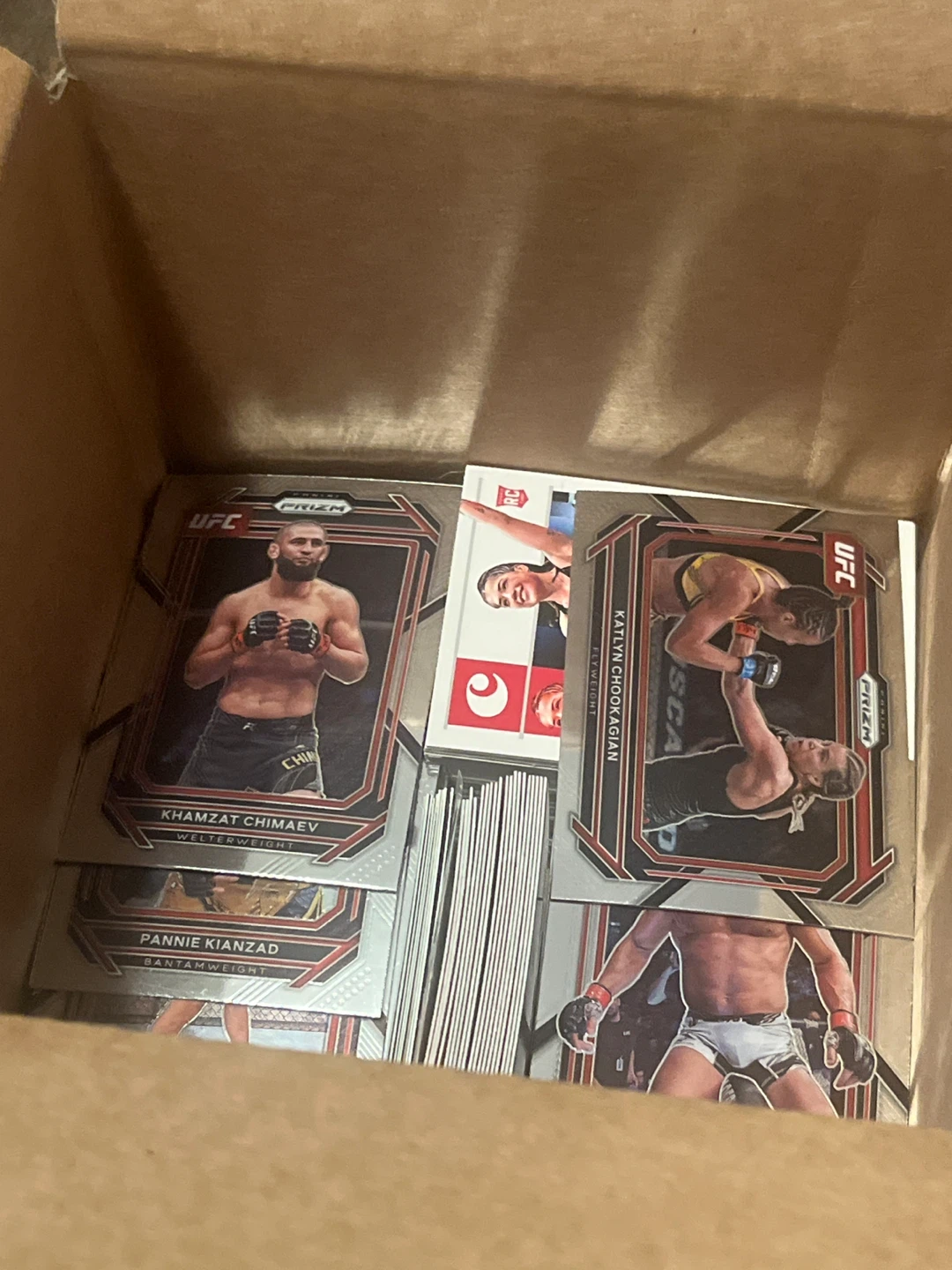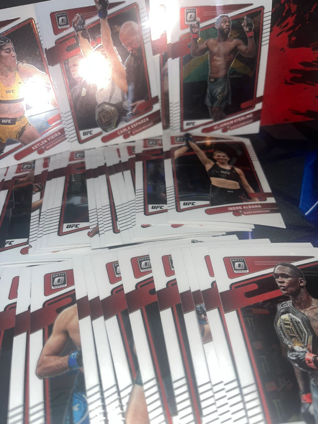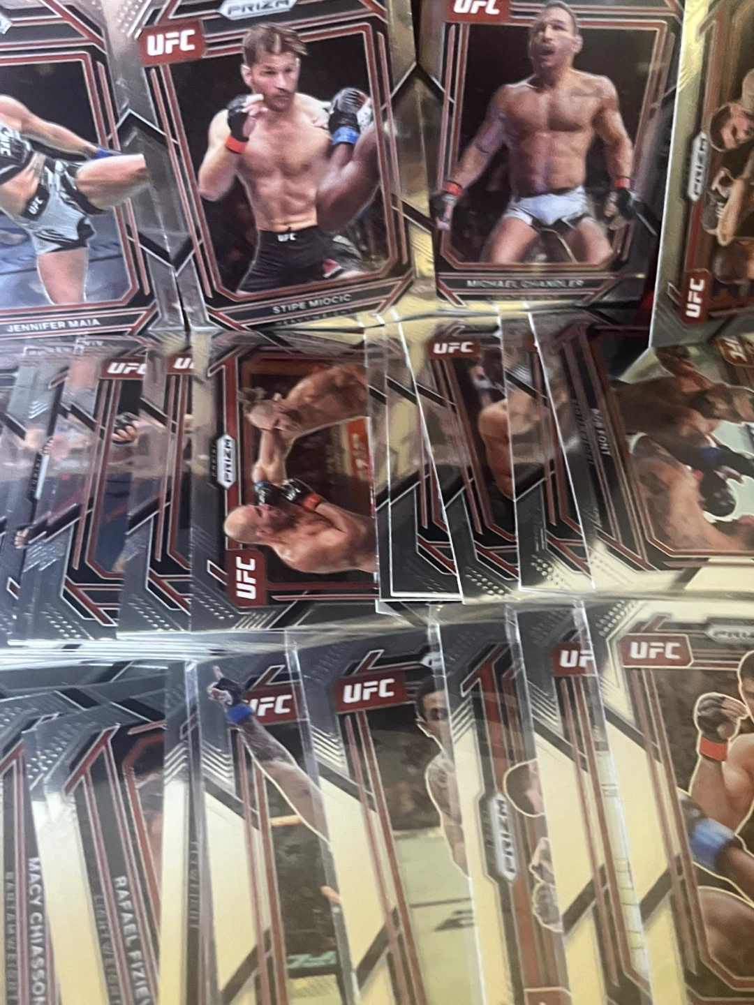 A collection of 2022-2023UFC Prizm trading cards featuring various fighters. These cards are from the Prizm series and showcase different UFC athletes. Great for any UFC fan or collector!
