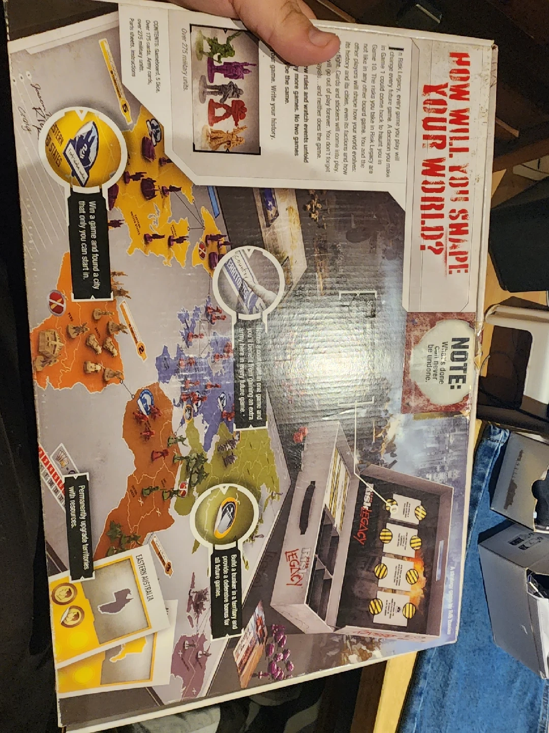 25Selling a Risk Legacy board game! It's a legacy game where your choices change the game forever. Includes over 275 military units and lets you permanently upgrade territories with resources. Make it your own!