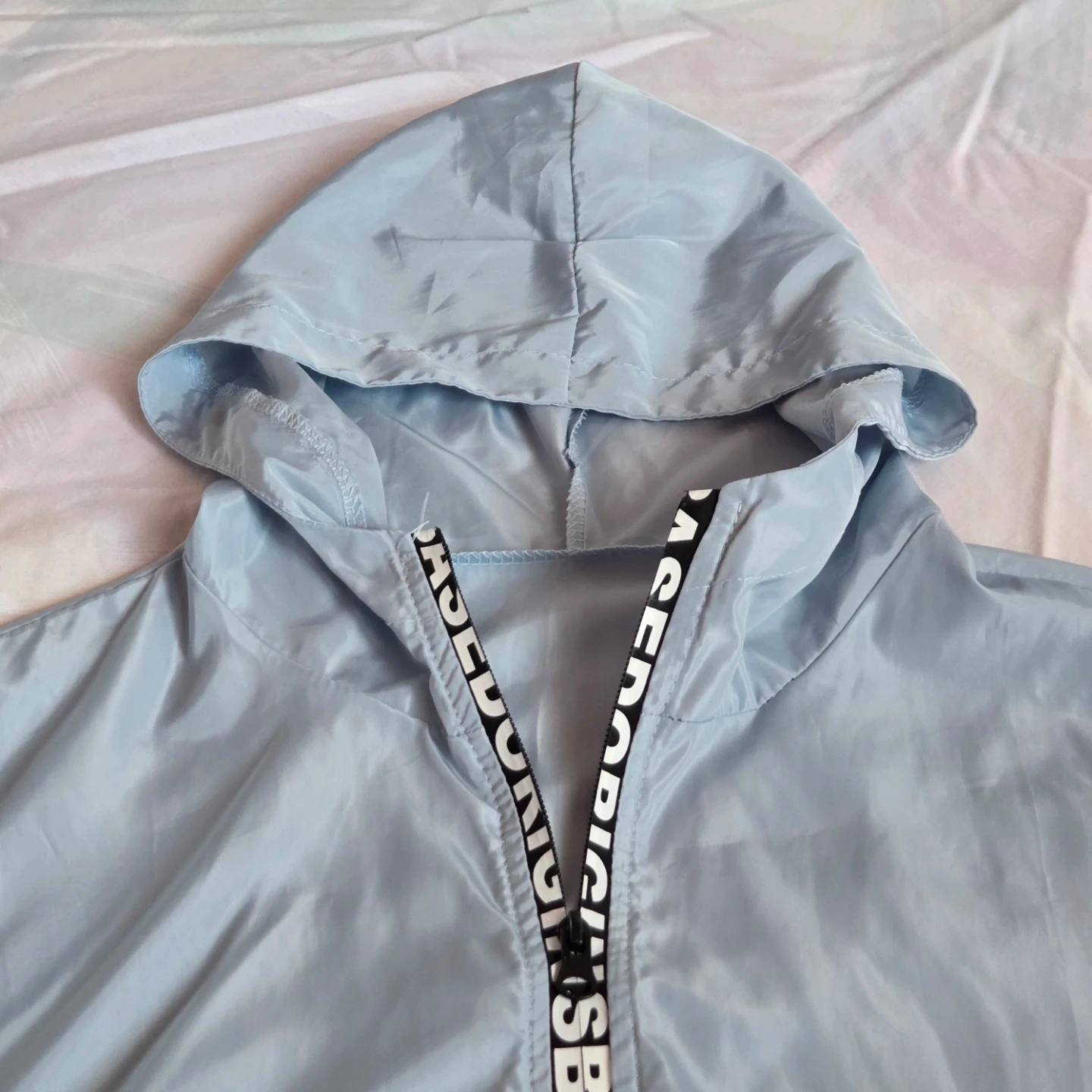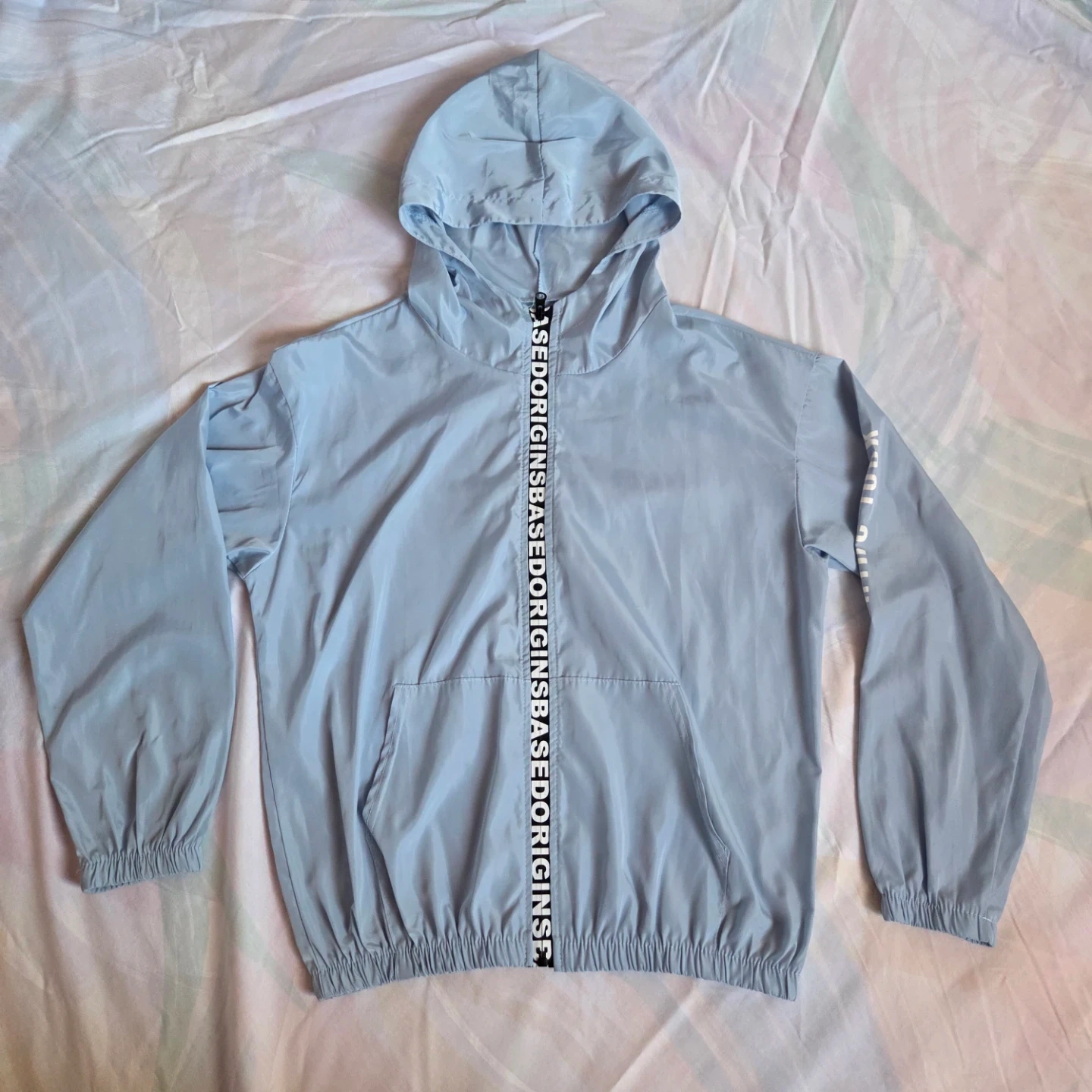 Selling a thin, light blue windbreaker that has side pockets and a hood