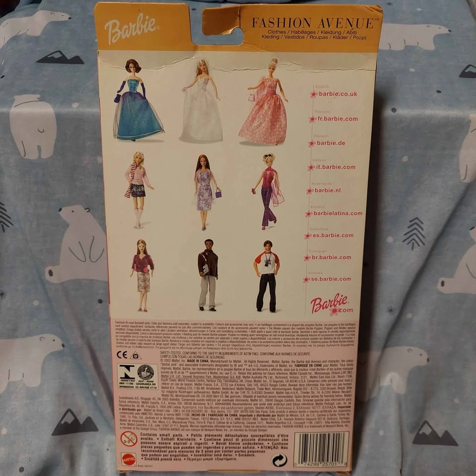Barbie's 2002 black and white striped halter top with a floral hemmed dress. This classy outfit is new and sealed in the box!