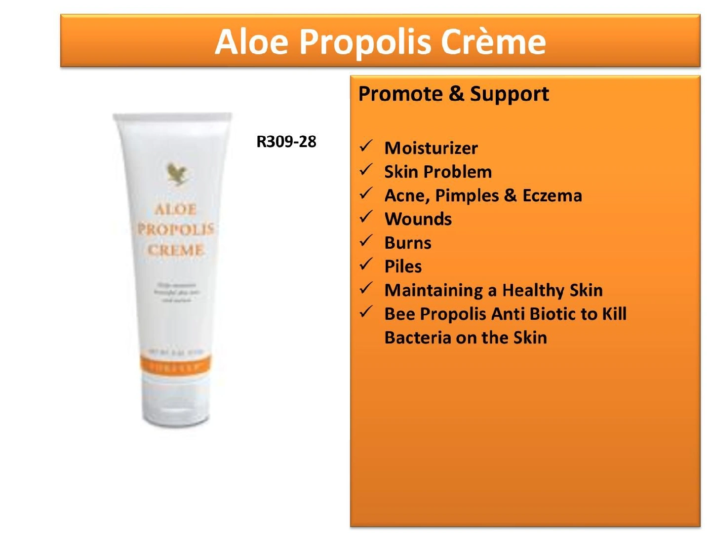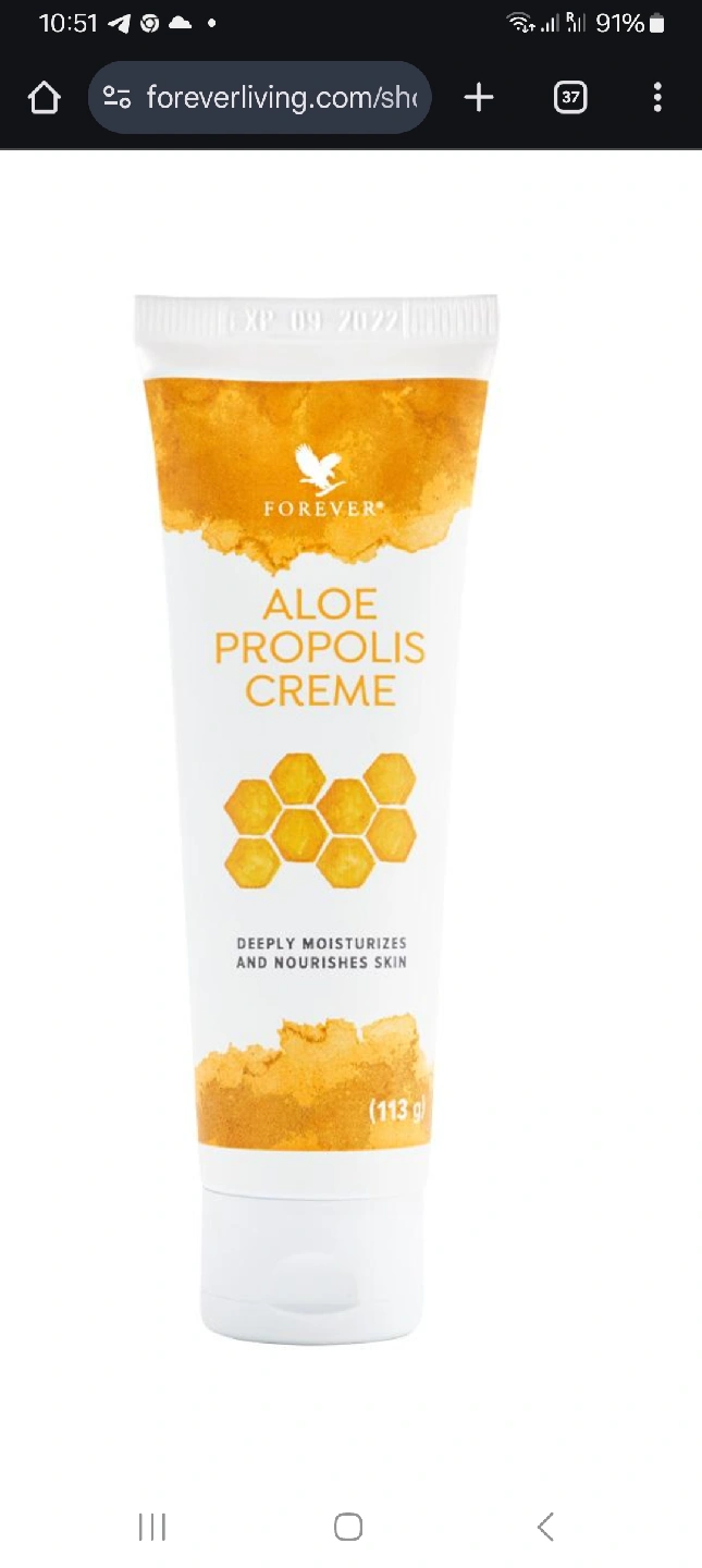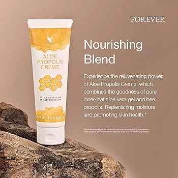 I'm selling a tube of Forever Aloe Propolis Creme. It's a nourishing blend that combines aloe vera gel and bee propolis. This creme deeply moisturizes and nourishes skin, leaving it feeling soft and rejuvenated. Net weight is 4 oz (113g)