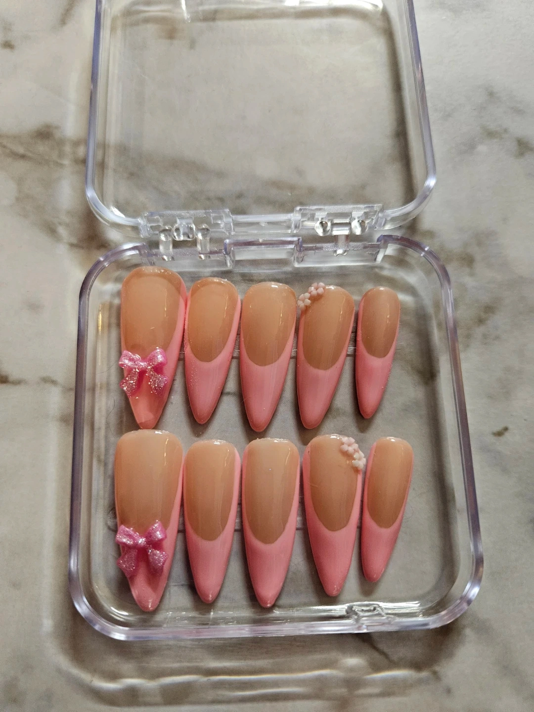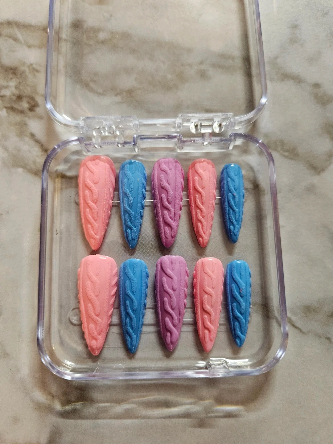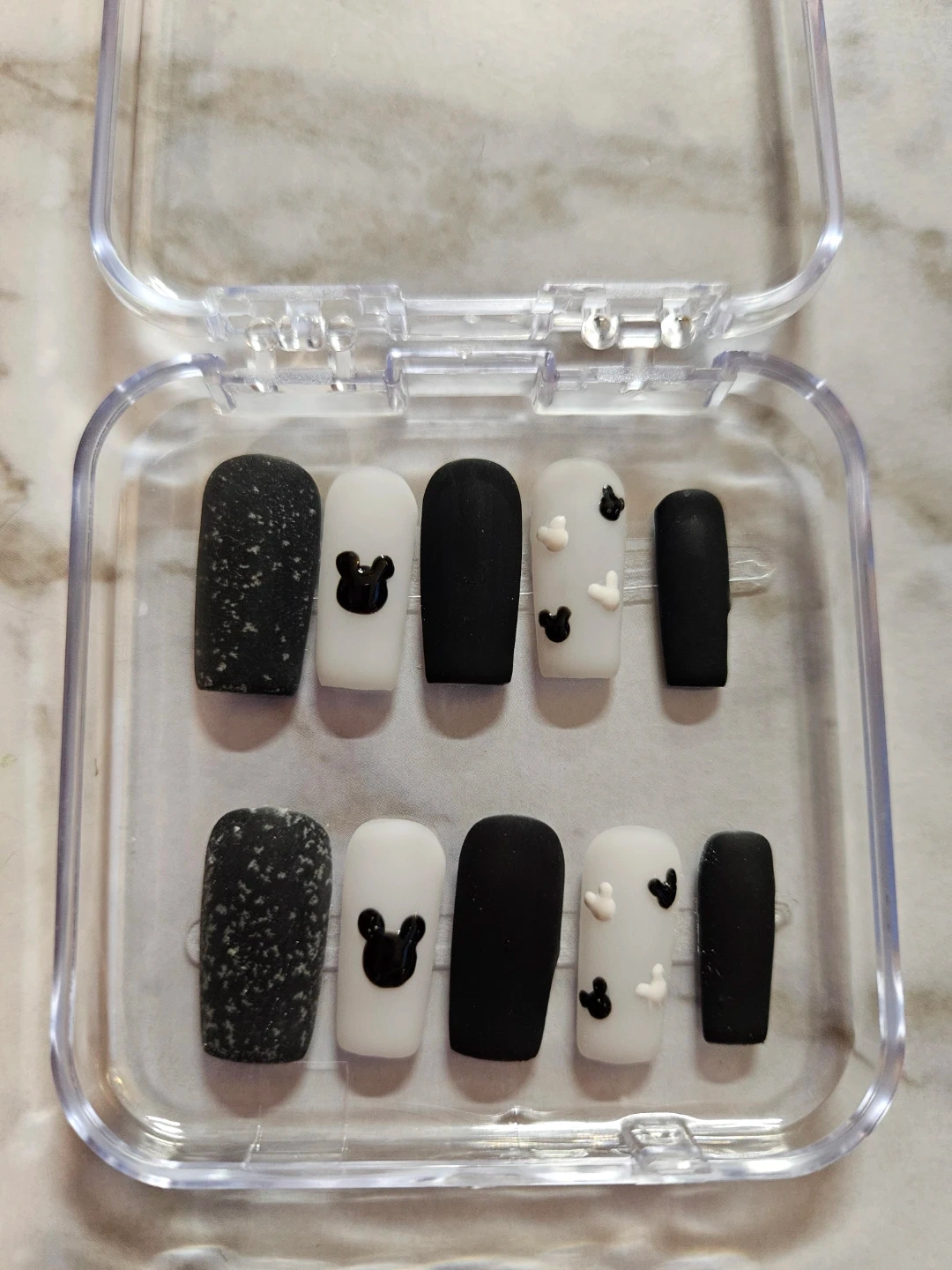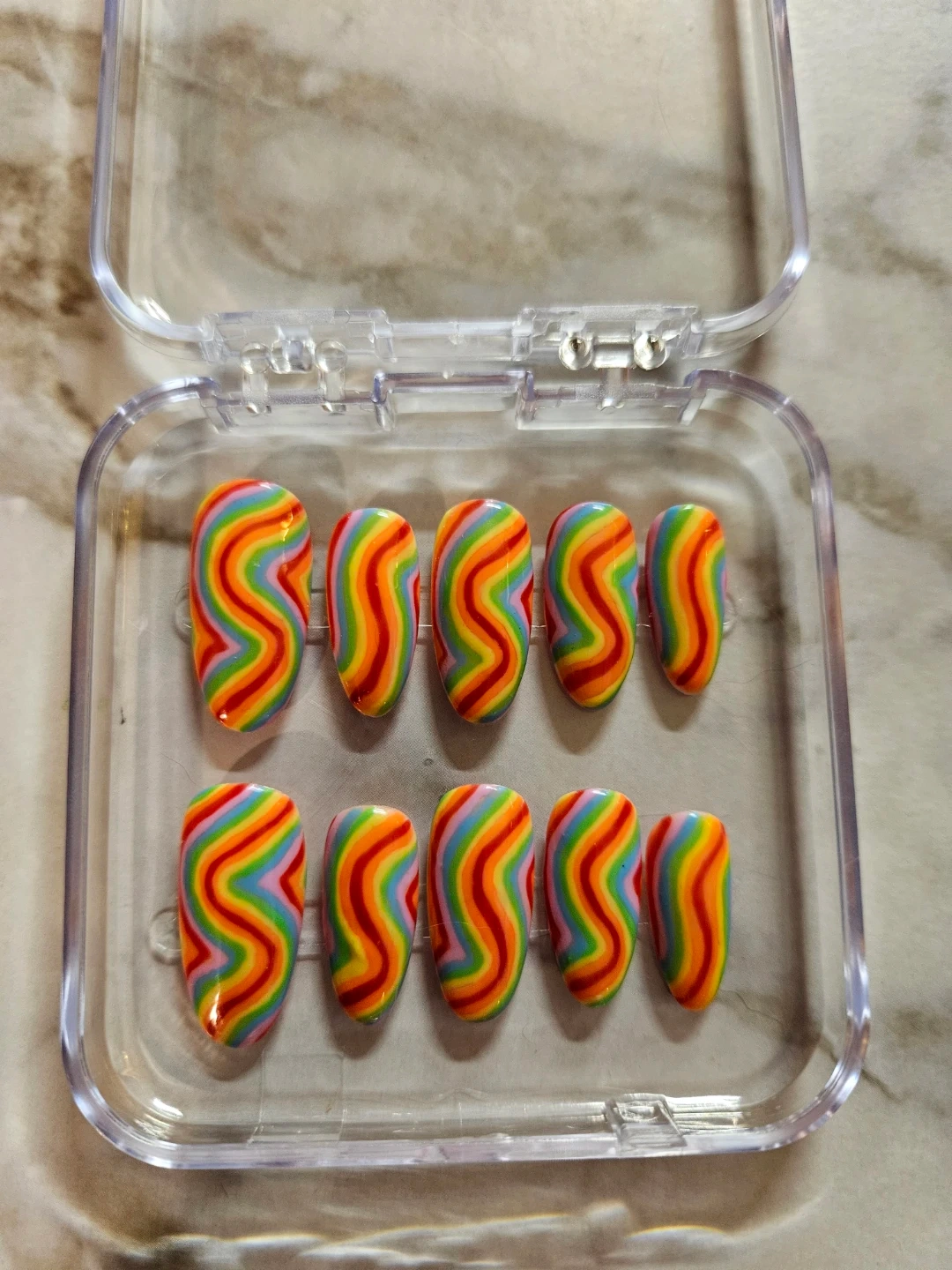 Selling a set of press-on nails in various designs. They come in a clear plastic case for easy storage and organization. Perfect for adding a touch of style to your look!