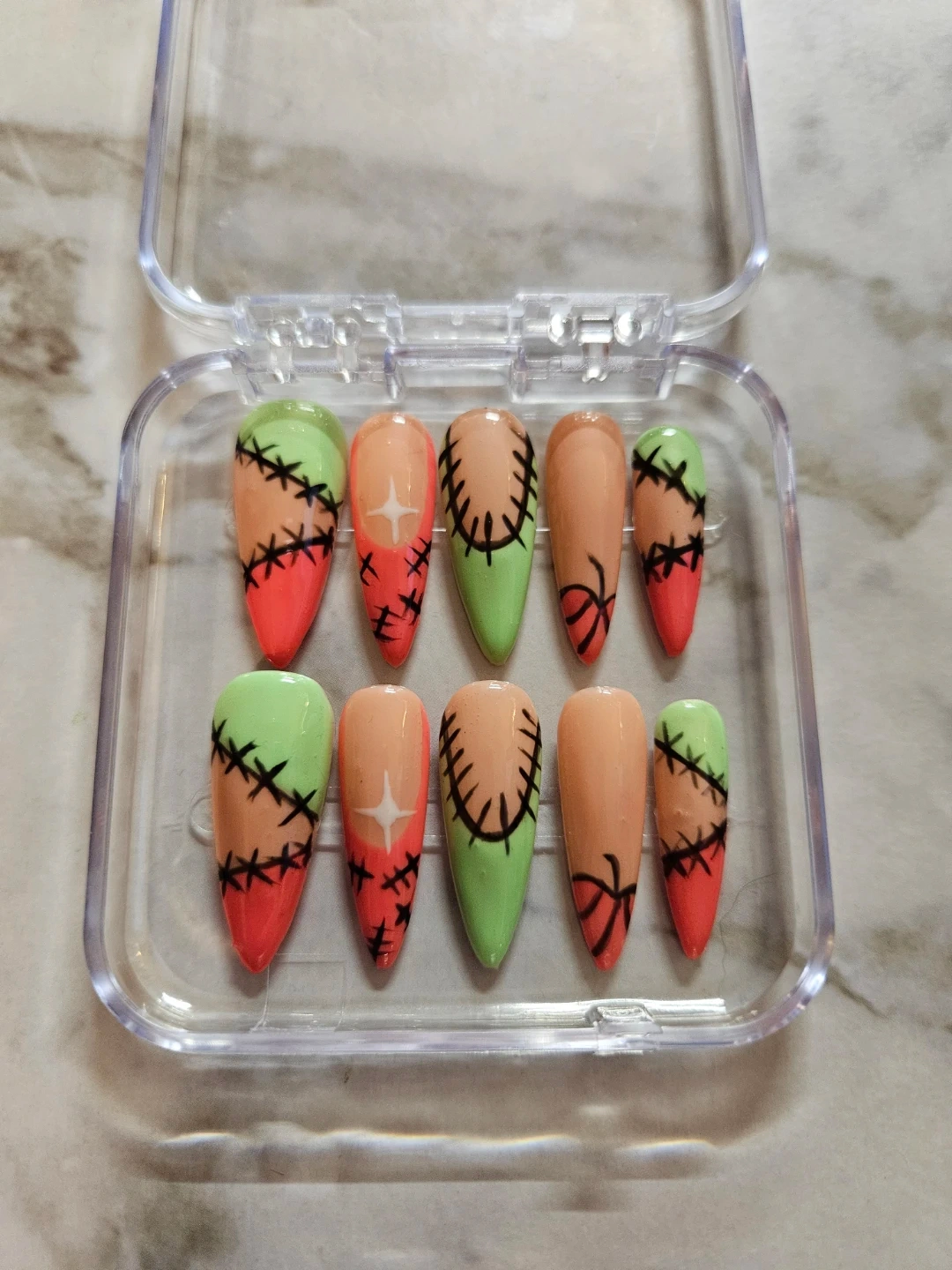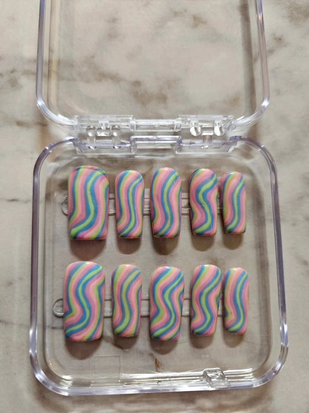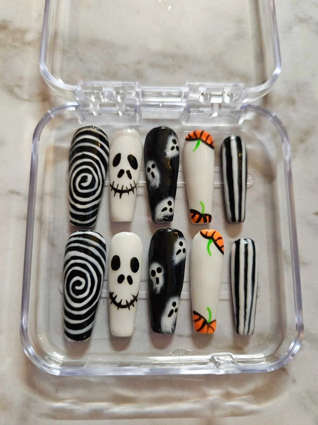 Selling a set of press-on nails in various designs. They come in a clear plastic case for easy storage and organization. Perfect for adding a touch of style to your look!