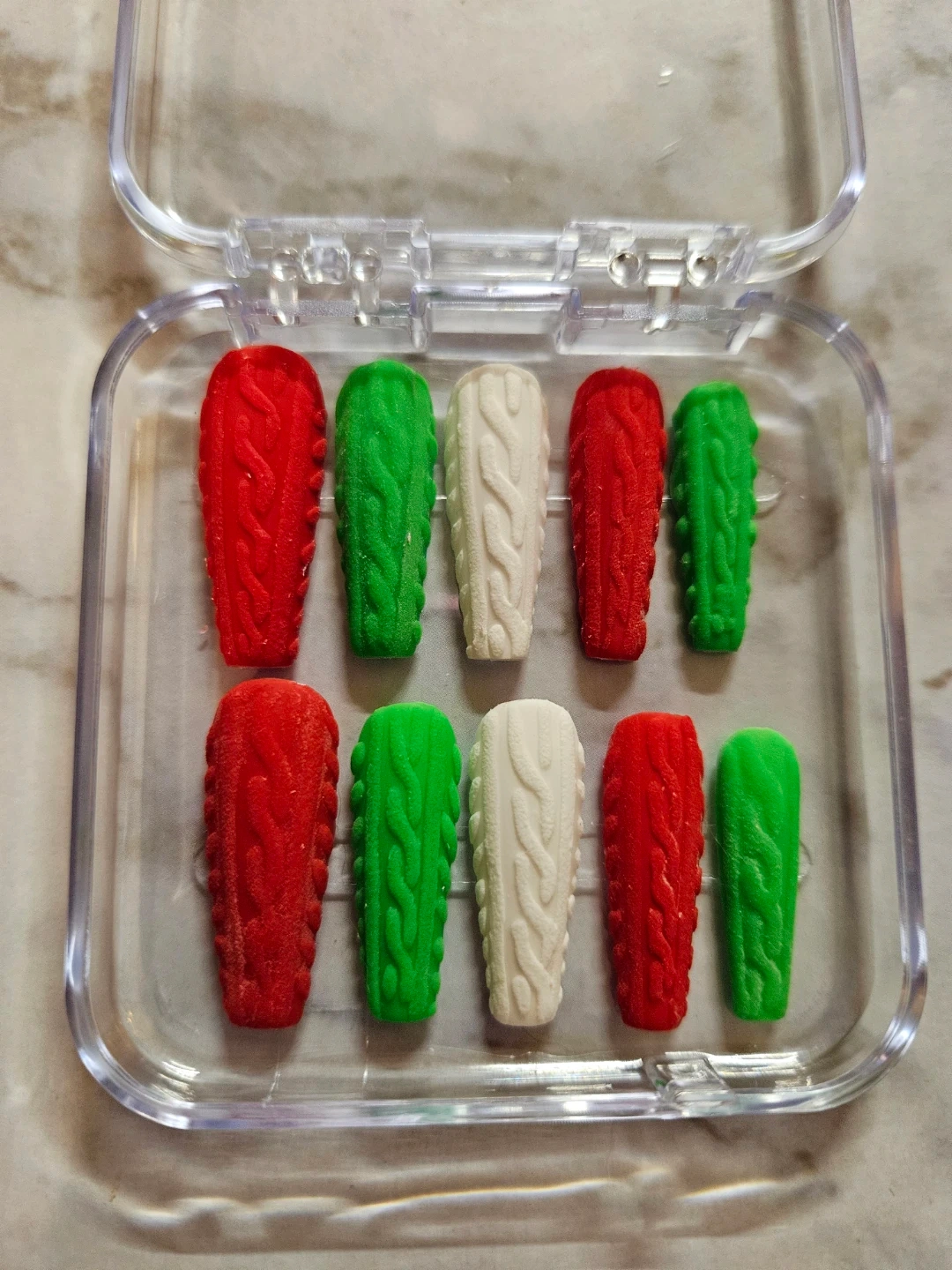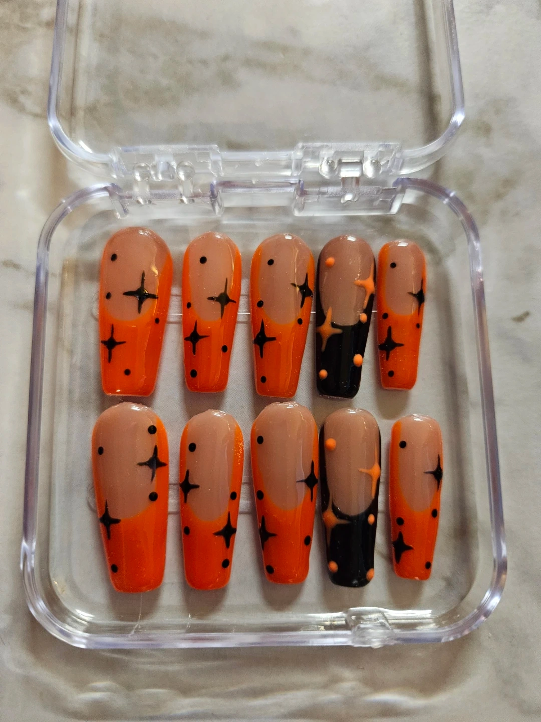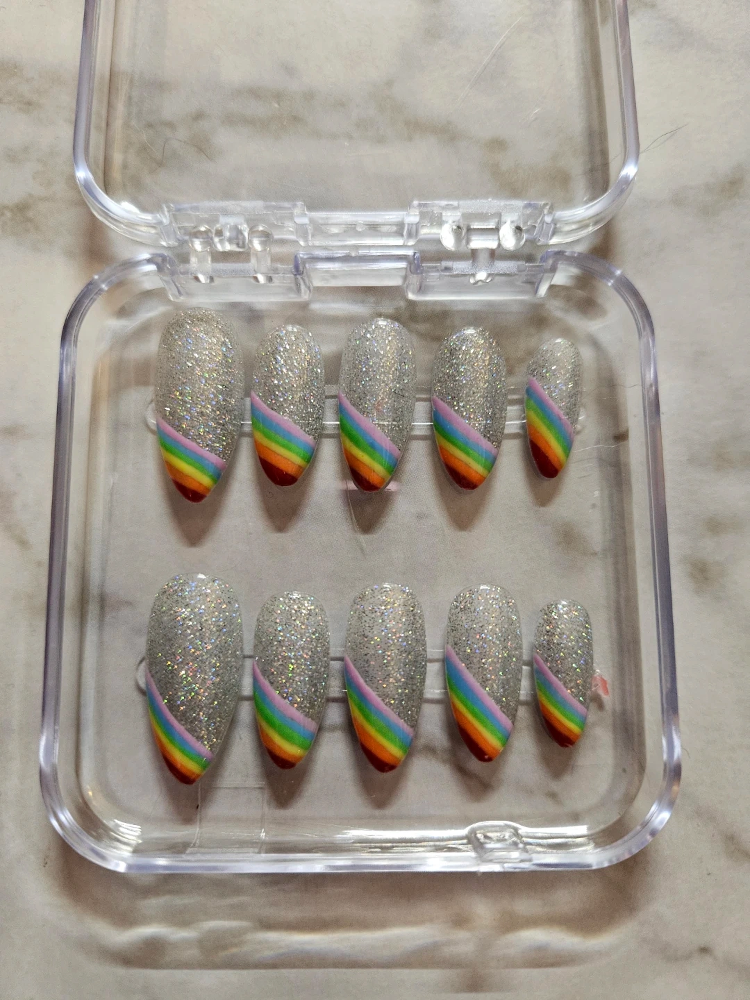 Selling a set of press-on nails in various designs. They come in a clear plastic case for easy storage and organization. Perfect for adding a touch of style to your look!