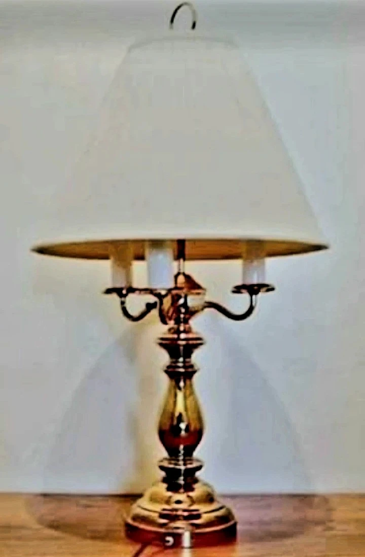 Elegant Vintage Tall Heavy Brass Table lamp, showcasing a timeless design with a shade. This lamp features three lights, offering ample brightness and a warm ambiance. Perfect for adding a touch of classic charm to any room.
