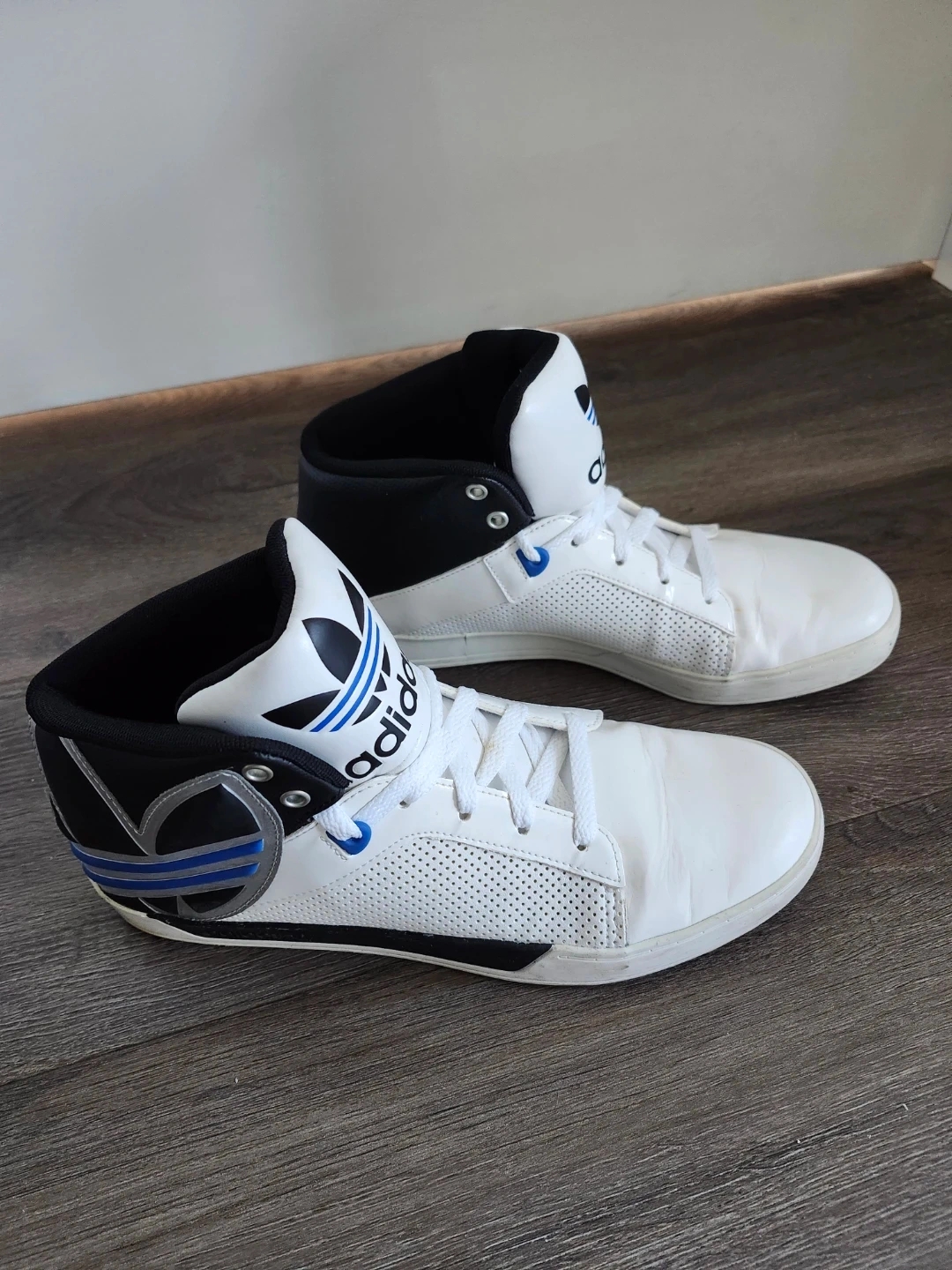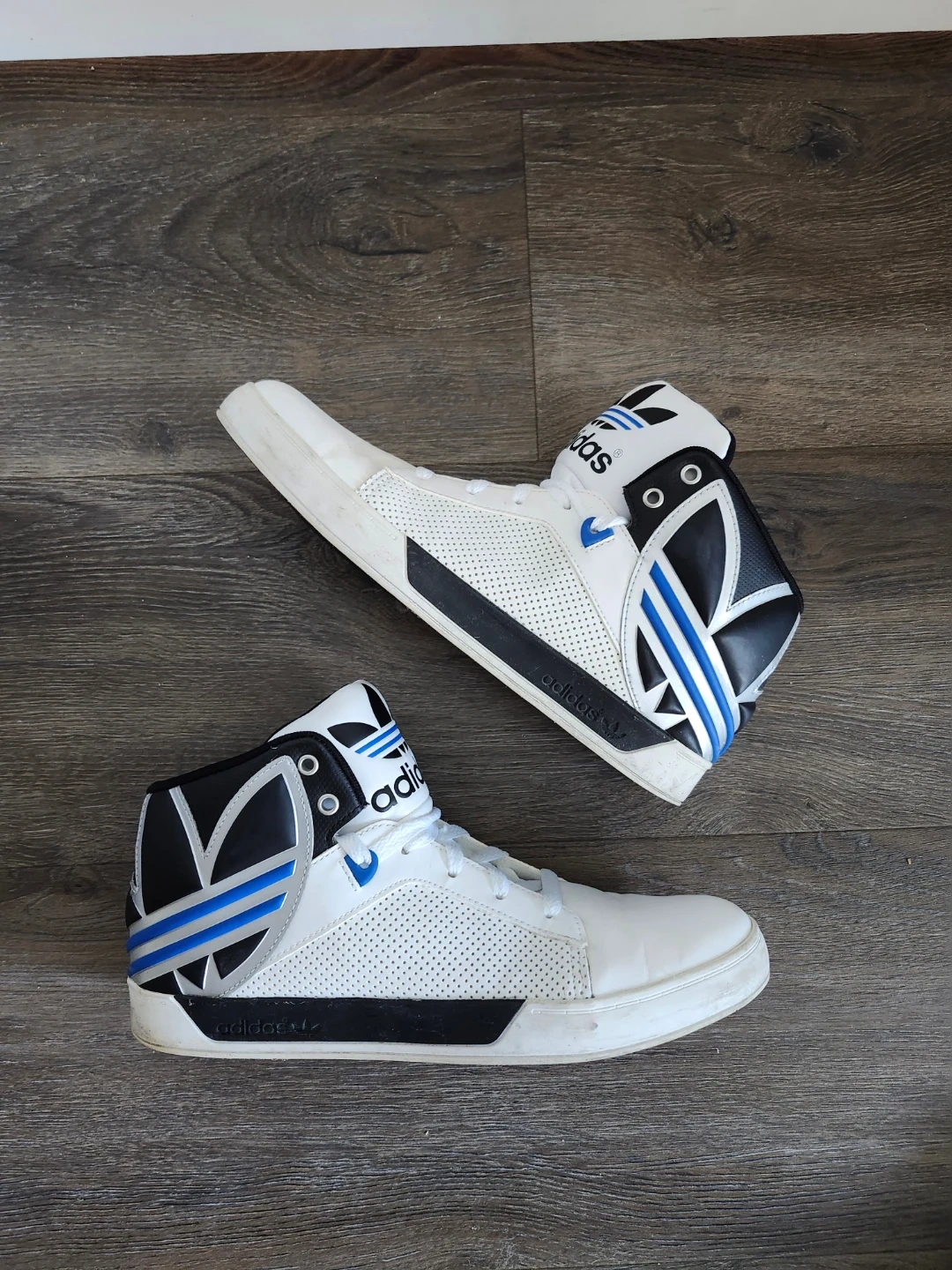 Near New. White and black Adidas high top sneakers. Features blue accent detailing and perforated toe box. Laces included.
