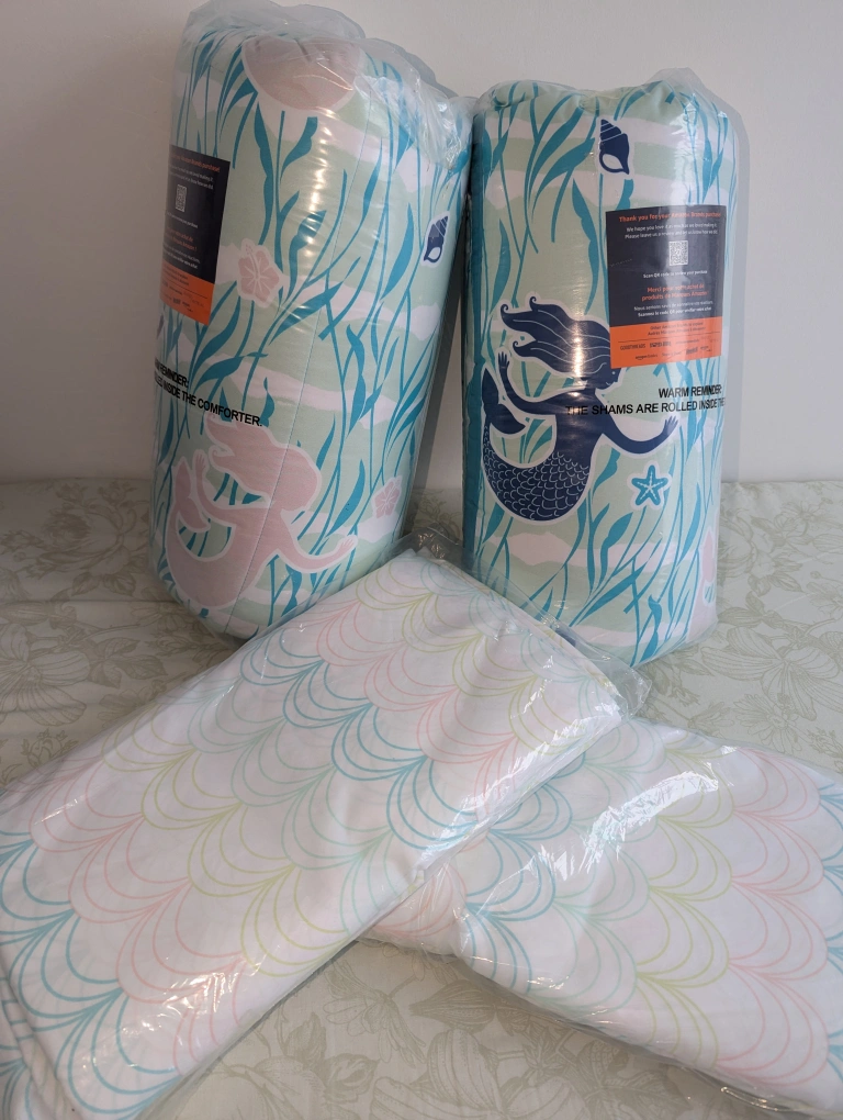 2 sets of full size bedding set with a mermaid design. Includes a comforter, two pillow shams, and a flat sheet.