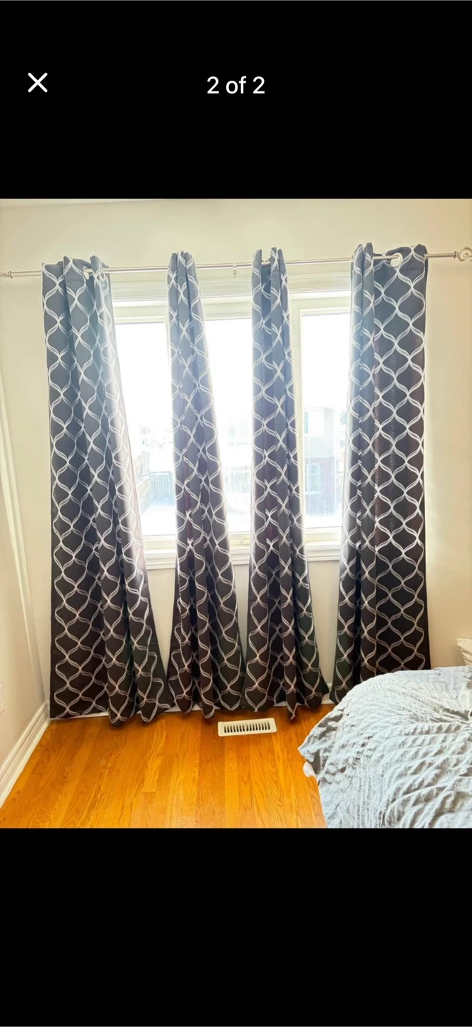 Set of four blackout curtains with a white geometric pattern. Each curtain measures approximately 50 inches wide and 80 inches long. Fabric is durable and easy to care for.
