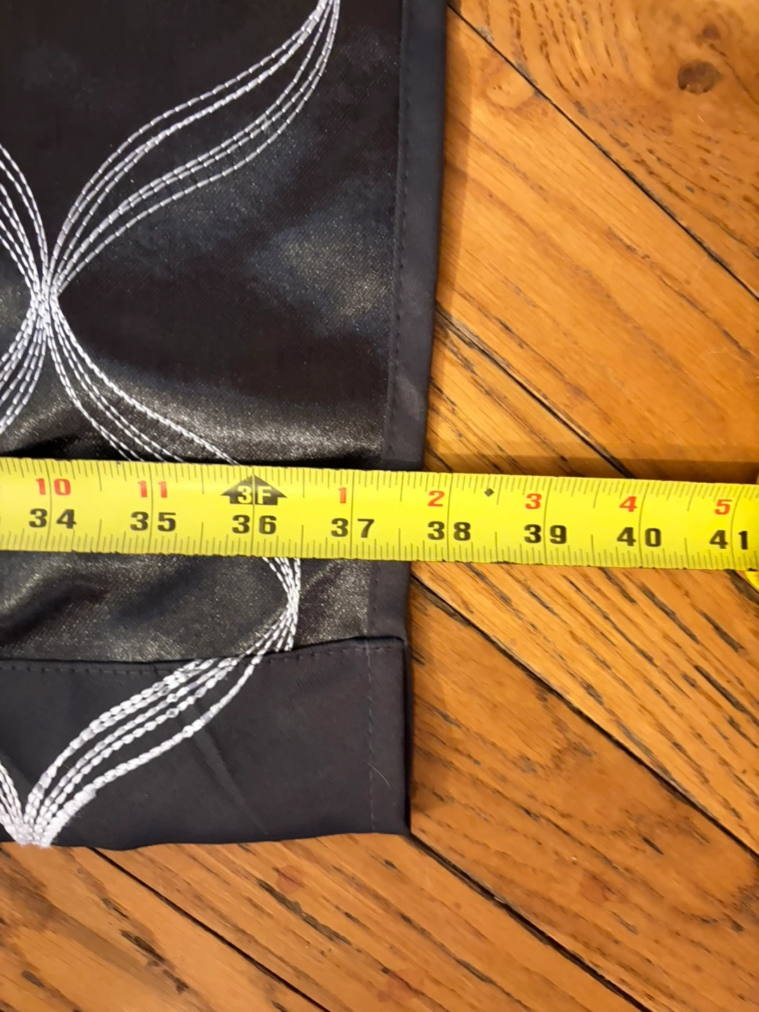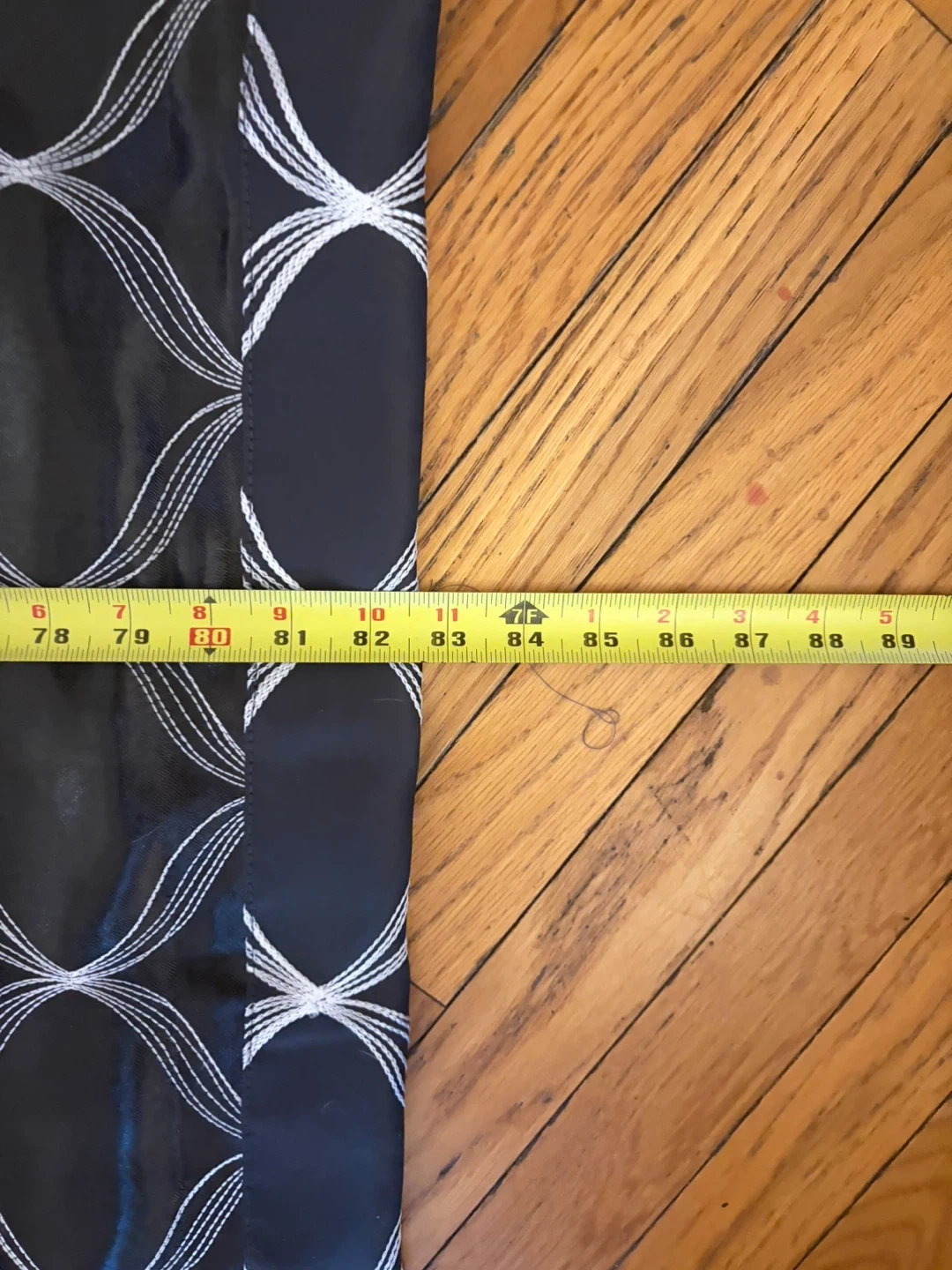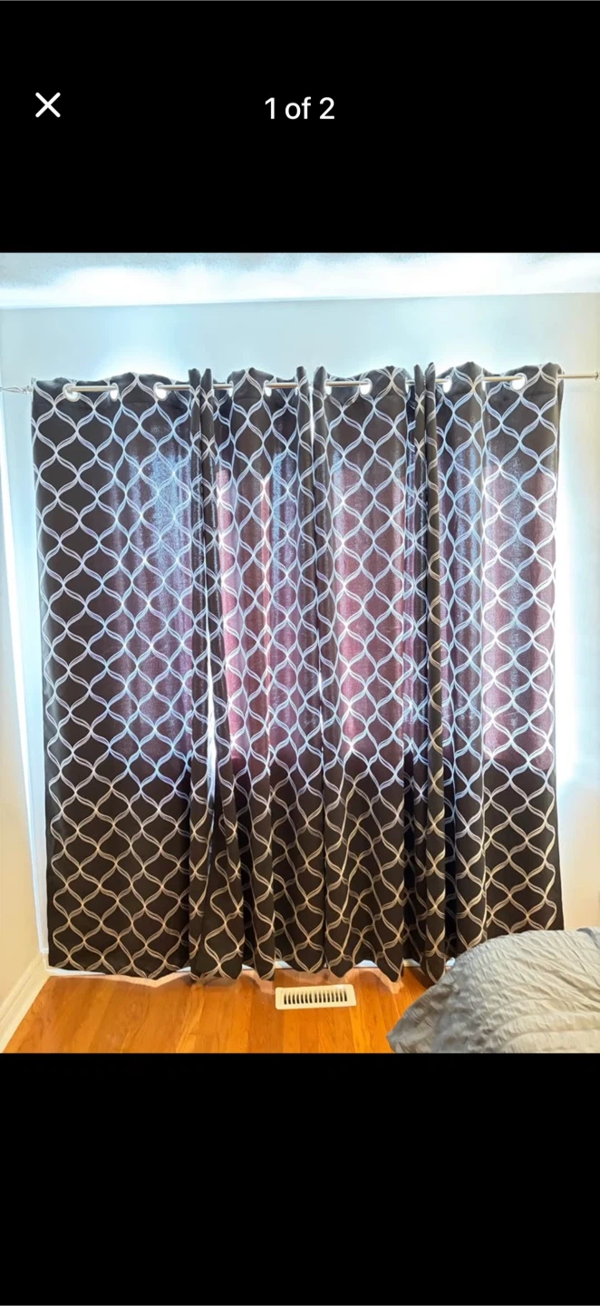 Set of four blackout curtains with a white geometric pattern. Each curtain measures approximately 50 inches wide and 80 inches long. Fabric is durable and easy to care for.