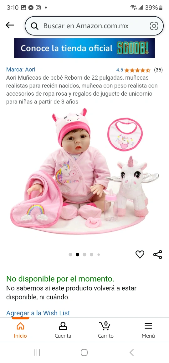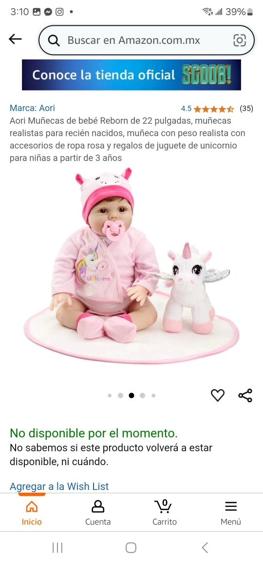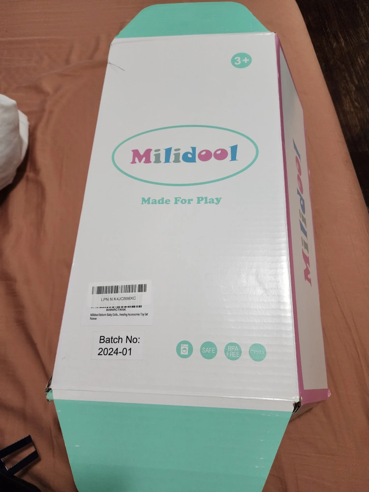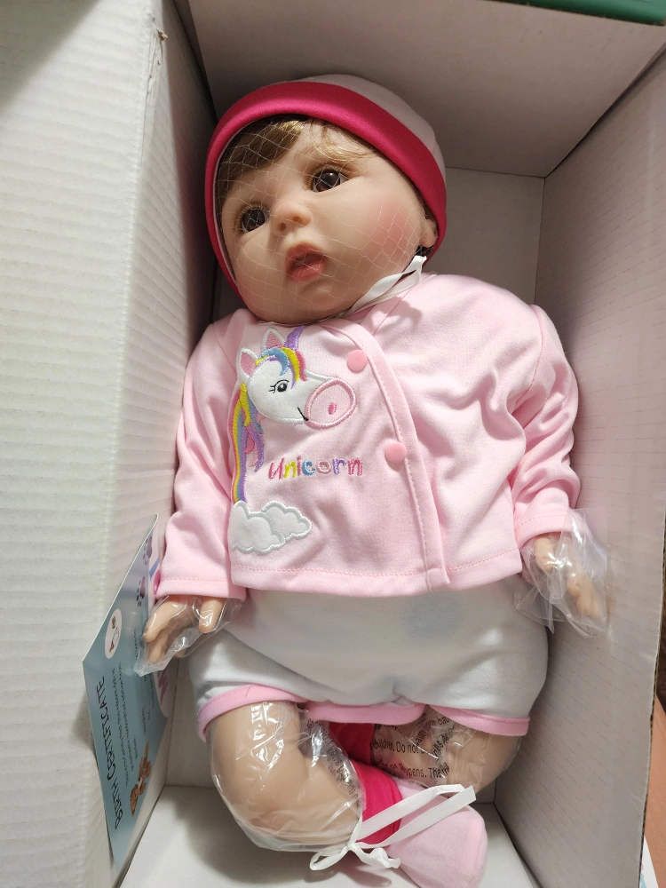 22 inch reborn baby doll. Includes pink outfit, unicorn plush, and bottle. Suitable for children aged 3+. Brand new in box.
