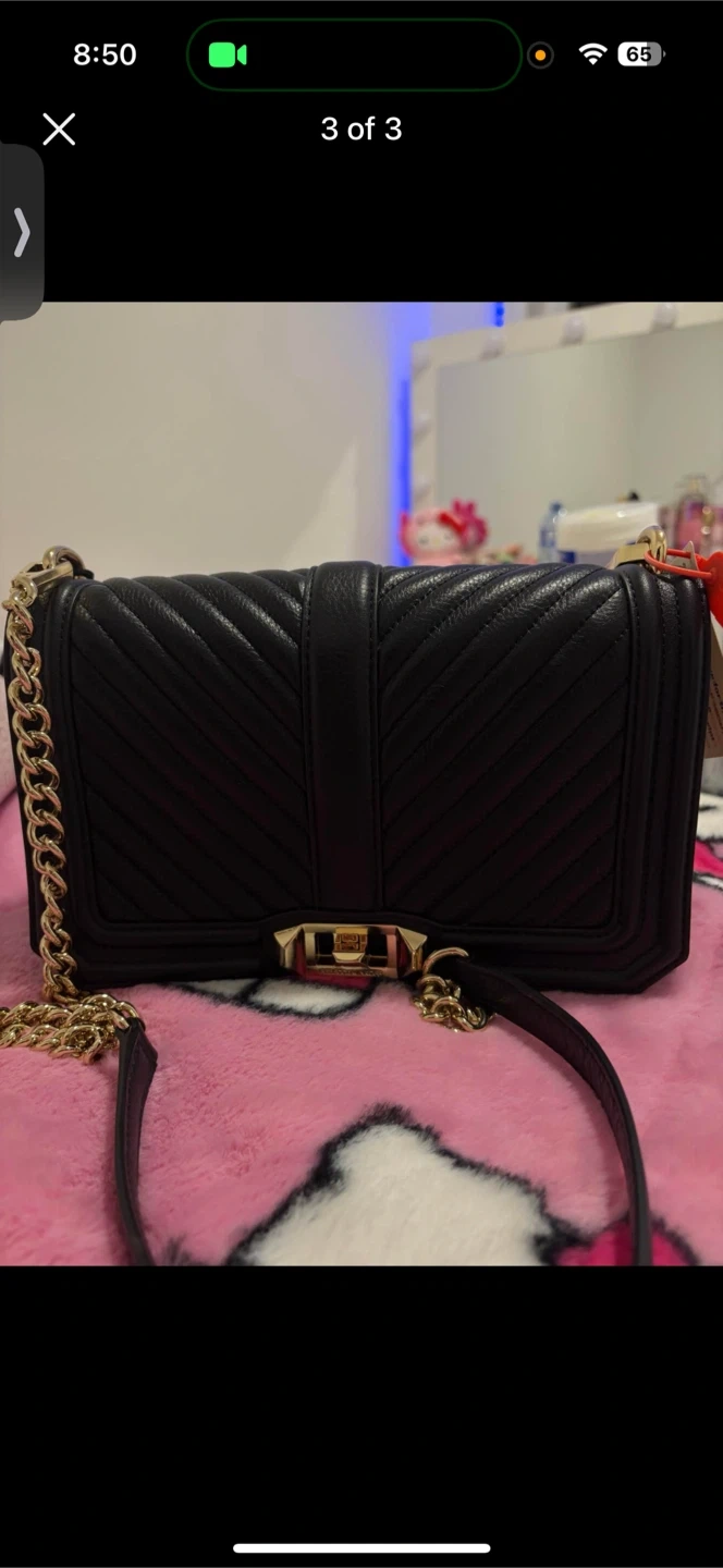 A black Rebecca Minkoff quilted shoulder bag. It's made of leather with gold-tone hardware. This bag is a stylish accessory for many occasions.