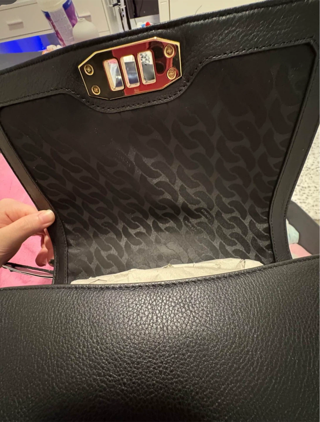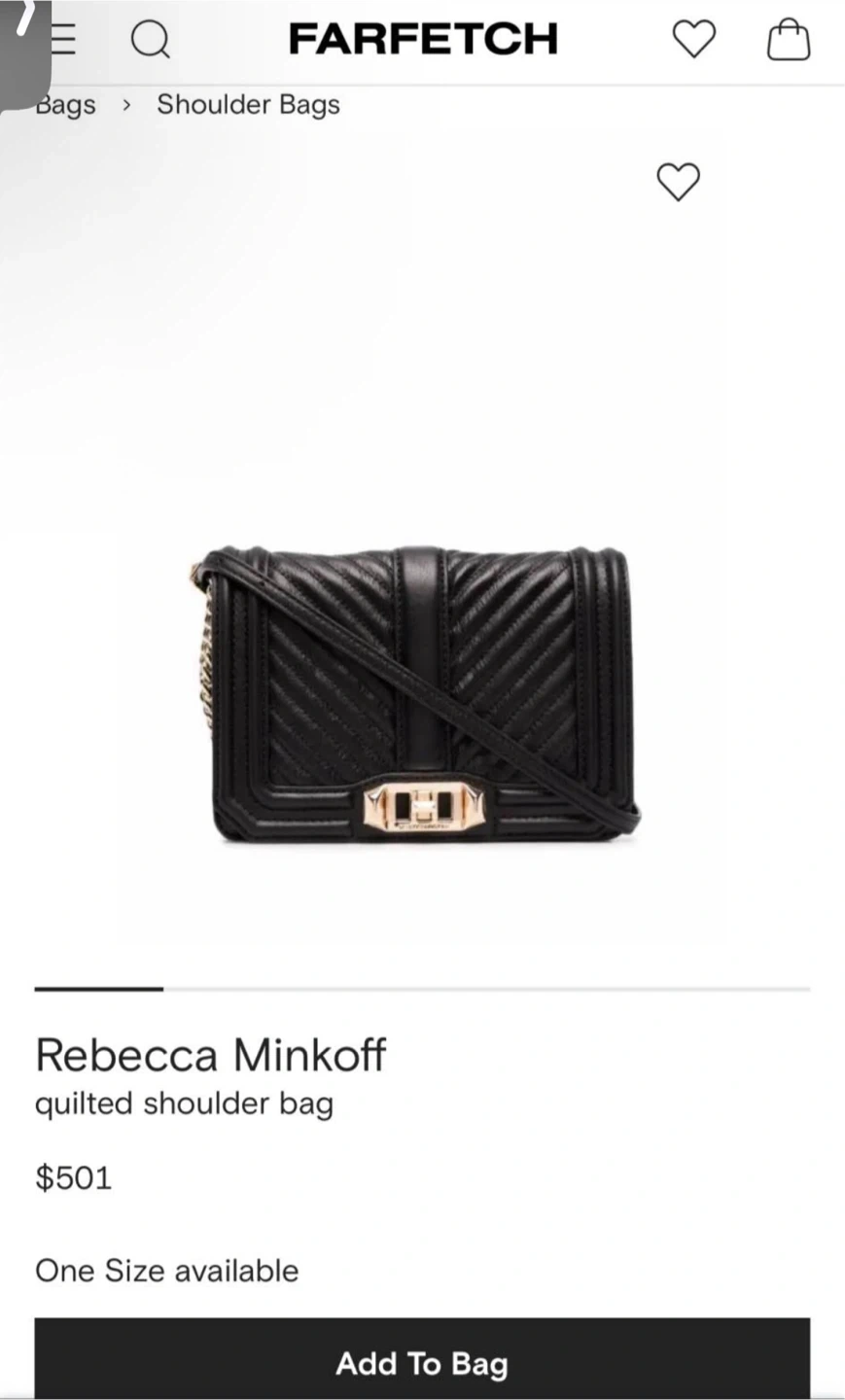A black Rebecca Minkoff quilted shoulder bag. It's made of leather with gold-tone hardware. This bag is a stylish accessory for many occasions.