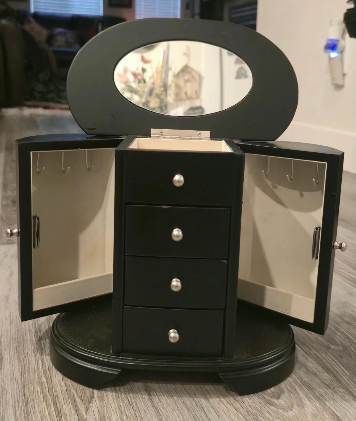 Black wooden jewelry box featuring a mirrored lid and multiple drawers for storage. It includes compartments for organizing jewellery and has small hooks inside the side doors.