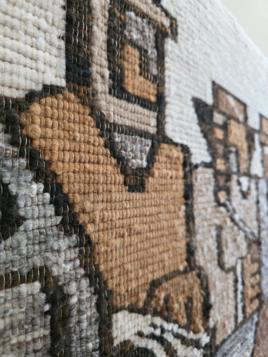 This is a woven wall hanging tapestry. It's made of mixed fibers in brown, beige, and grey tones. Features a scene with stylized figures and objects. From Ecuador.