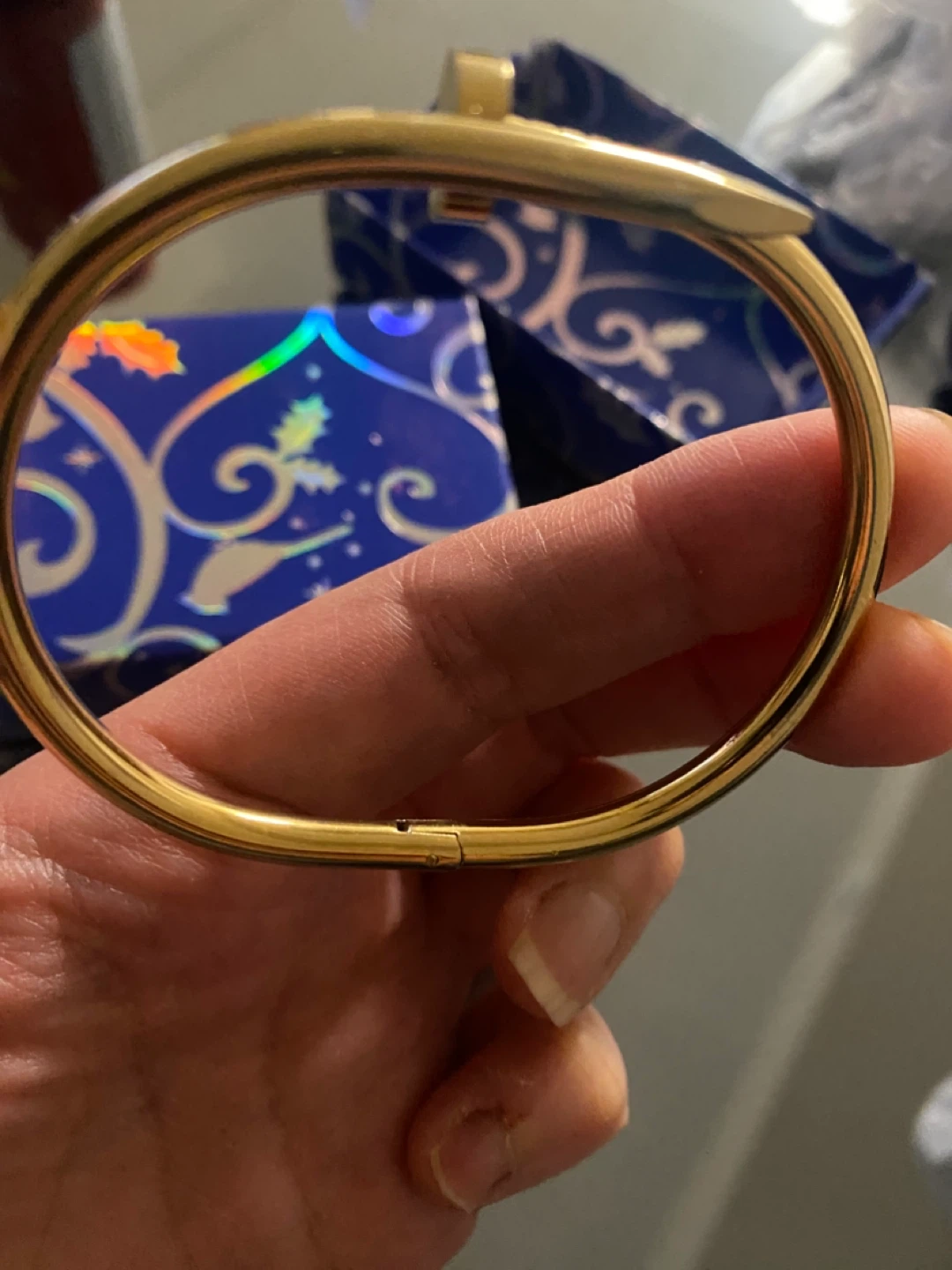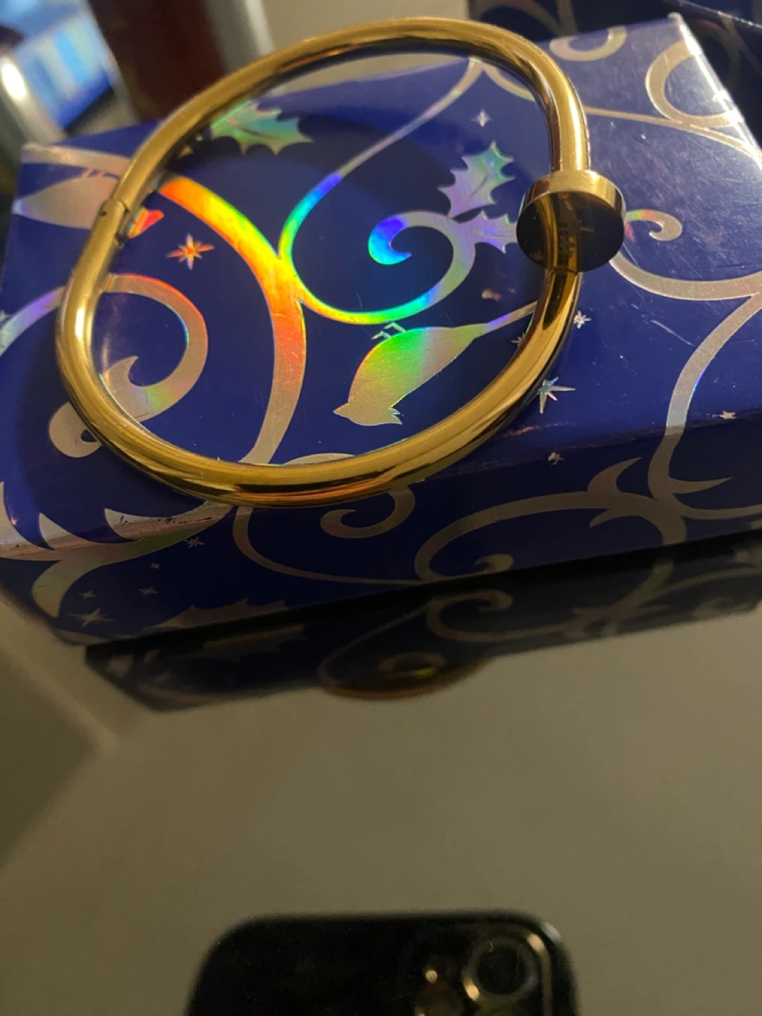 This gold tone bangle bracelet features a unique nail design. It's a stylish accessory that adds a touch of elegance. The bracelet opens with a clasp mechanism.inspired by Cartier not ethentic