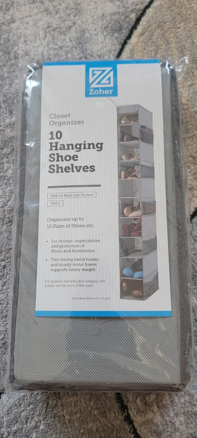 This Zober closet organizer features 10 hanging shoe shelves in grey. It includes 10 mesh side pockets for extra storage and organizes up to 10 pairs of shoes. It's made with two strong metal hooks and a sturdy metal frame to support heavy weight.