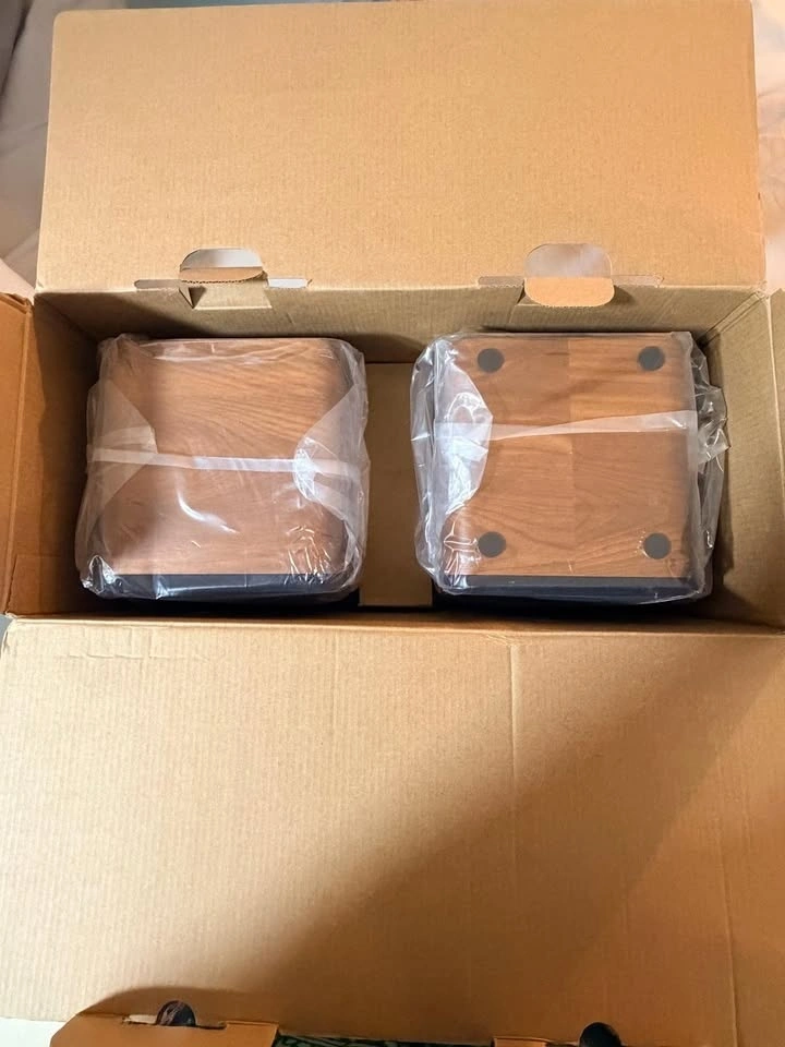 Never used MEVOSTO DS19 Powered Bookshelf Speakers in a stylish wooden brown finish. These active studio monitors are perfect for record players, PC gaming setups, home theaters, or casual music listening. They are still in the original protective plastic and have only been unboxed for photos.