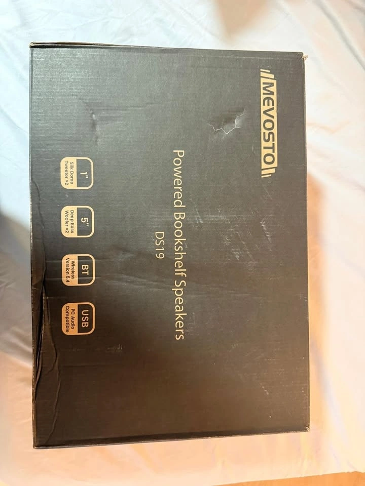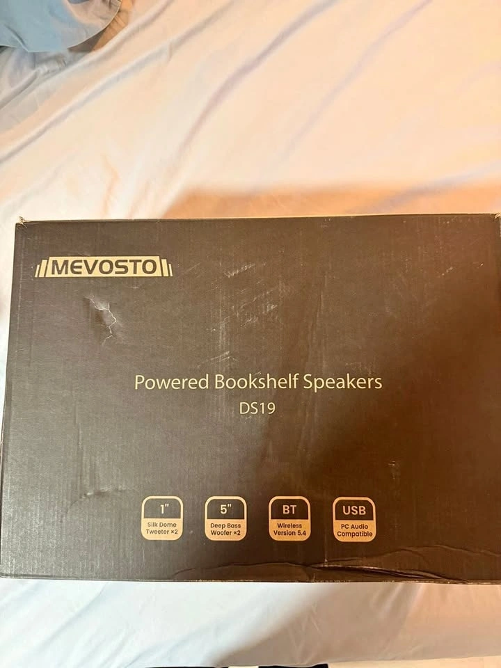 Never used MEVOSTO DS19 Powered Bookshelf Speakers in a stylish wooden brown finish. These active studio monitors are perfect for record players, PC gaming setups, home theaters, or casual music listening. They are still in the original protective plastic and have only been unboxed for photos.