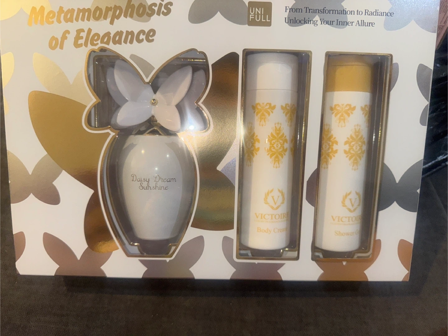 I'm selling a UNI FULL perfume set that includes a bottle of Daisy Dream Sunshine perfume, body cream, and shower gel. It's a great set to give as a gift! $15 each