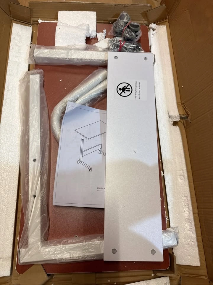 One corner is slightly damaged but easily fixable. Dimensions: 31.4"L x 15.7"W x 27.5"-34.6"H. Max load capacity: 66 lbs. This adjustable desk with wheels is simple, practical, and suitable for small spaces, matching most home or office decor. Made with an environmental particle wood panel with a high glossy, waterproof, and anti-scratch finish, and a heavy-duty powder-coated metal frame for stability and durability. Ergonomic height adjustment from sitting to standing for a healthier work style. Features 4 wheels for easy mobility, with 2 lockable wheels to keep it steady.