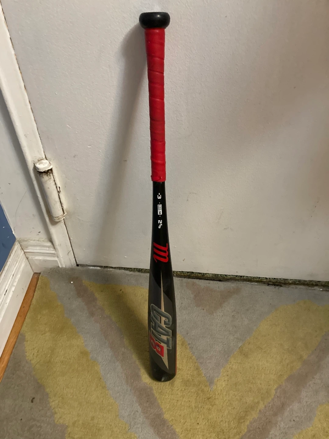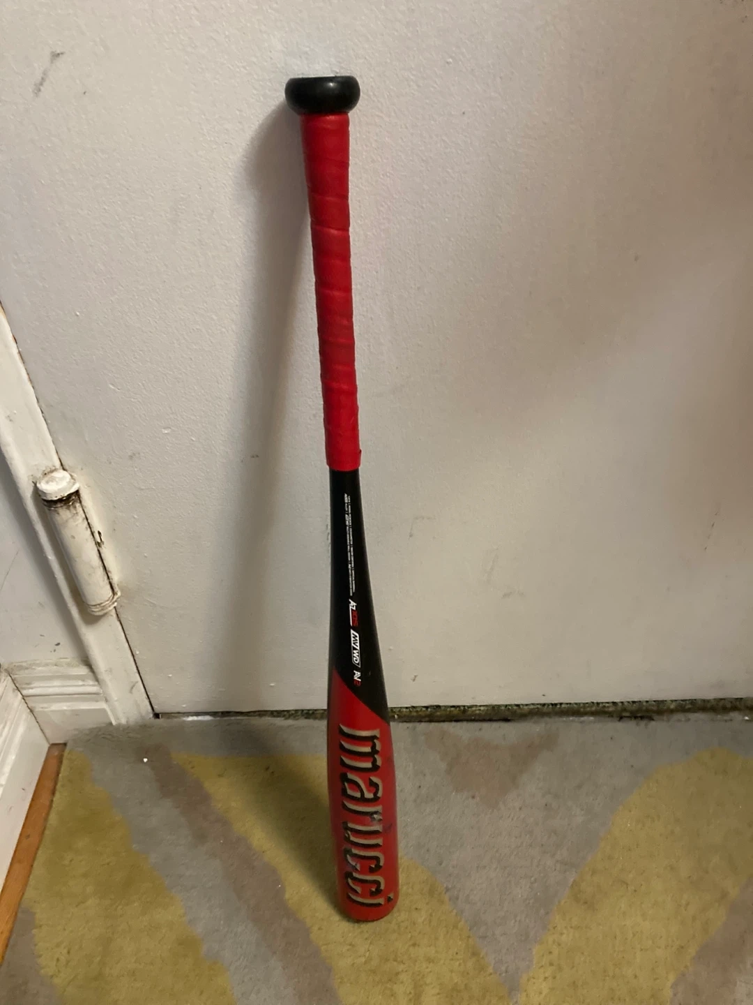 This Marucci CAT alloy baseball bat is black and red. It has a red grip and a black knob. The bat is 30 inches long. Amazing bat for a very cheap price used for a short amount of time and hits like a new bat.