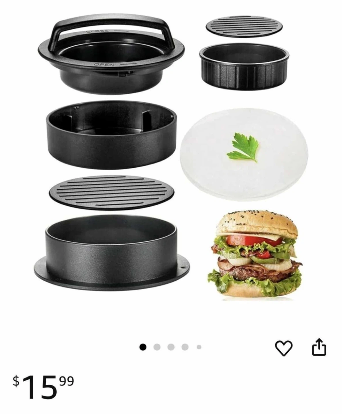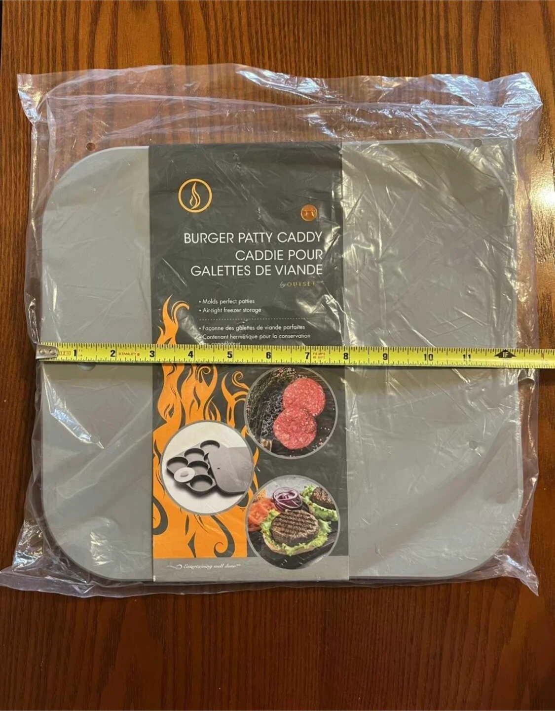 $25 Outset silicone burger press and storage tray with lid for 8 burgers.