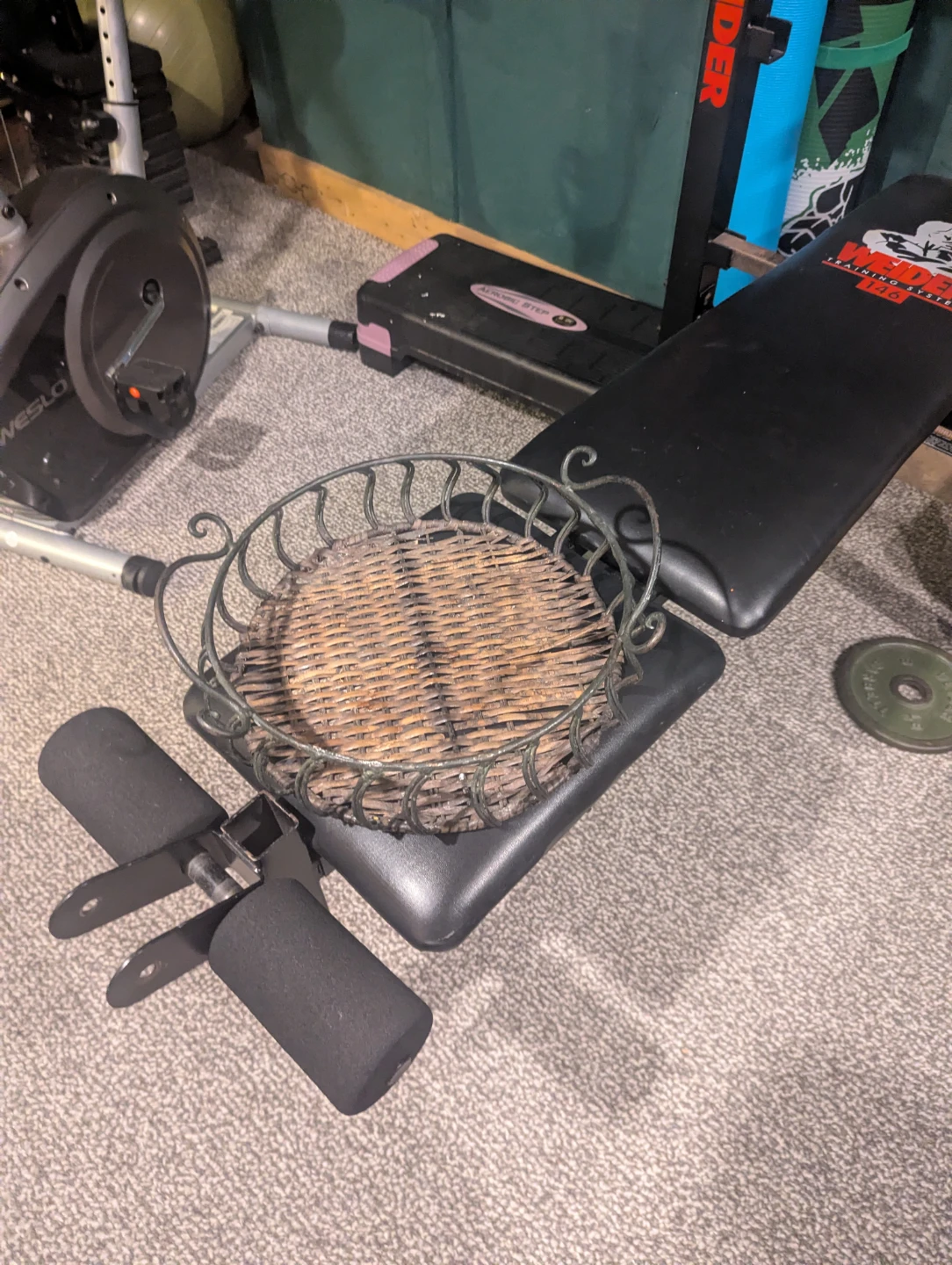 A lovely decorative basket with a wicker base and a metal scrolled frame. It's perfect for holding fruit, bread, or other small items.