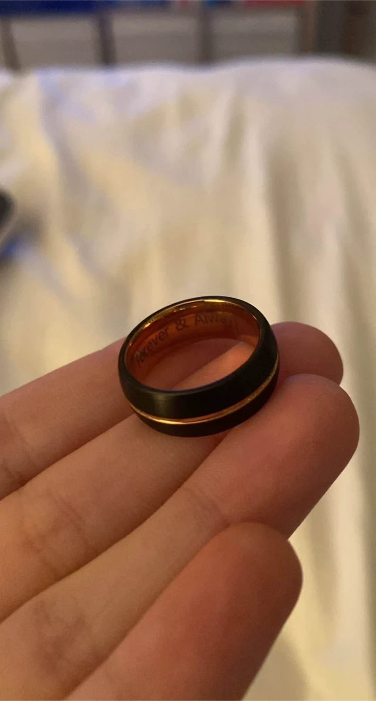 This is a Gentlebands men's ring in a black and gold design. It comes in a metal tin with a sleeve and a card. The inside of the ring is engraved with 'Forever & Always'.