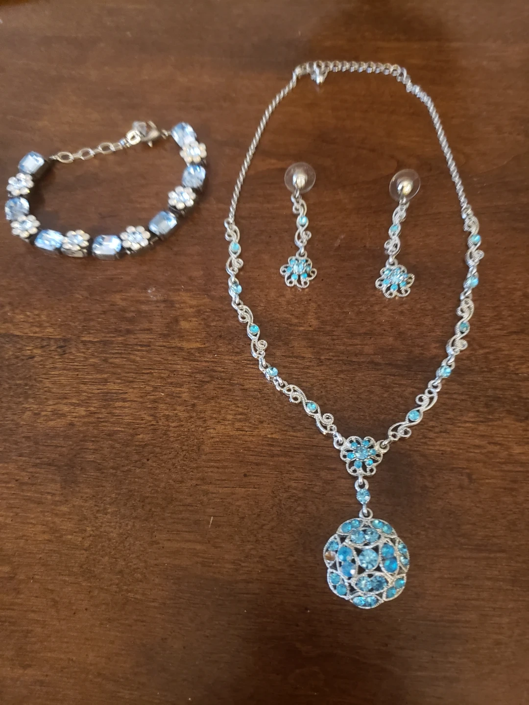 This jewellery set includes a necklace, a bracelet, and a pair of earrings. It's adorned with blue crystals and silver-tone metal. This set would be lovely for a special occasion!