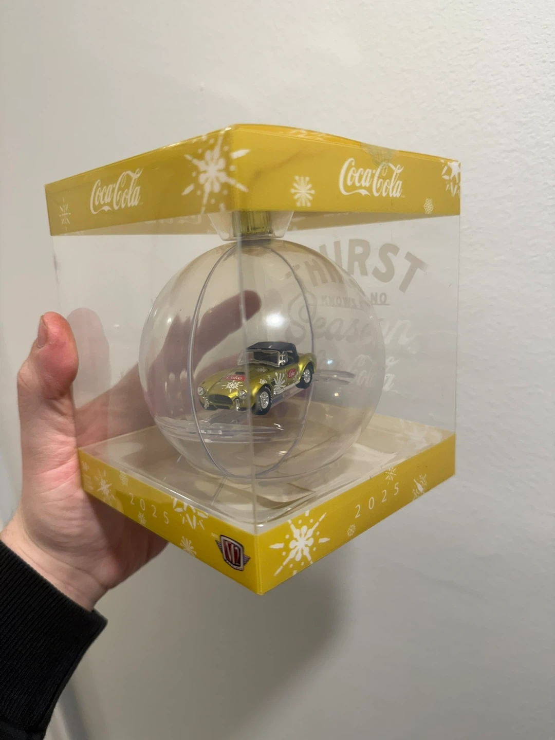 Selling a brand new Coca-Cola ornament featuring an M2 Machines car inside! The box has a festive design with snowflakes and the Coca-Cola logo. Perfect for collectors or as a unique holiday decoration