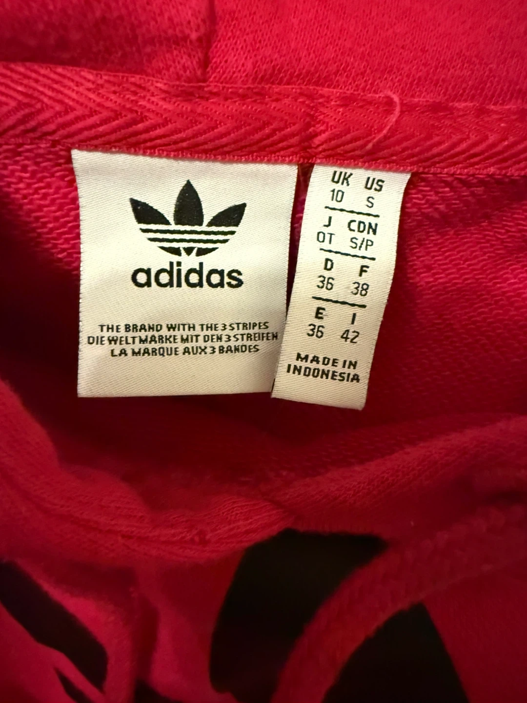 This is a bright pink Adidas cropped hoodie. It's a size S with the classic trefoil logo on the front. Made in Indonesia.