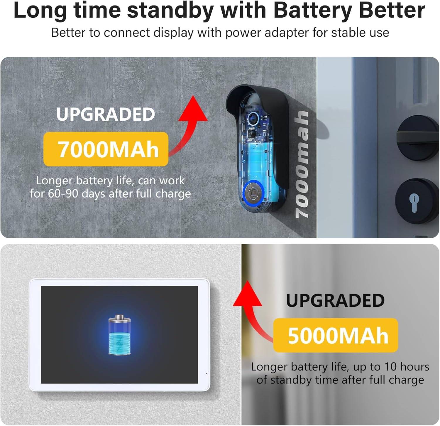 Extended Battery Life: Upgraded 7,000mAh rechargeable lithium battery, our video doorbell security camera can last up to 60-90 days on a full charge, depending on usage frequency, motion detection, and local temperatures.