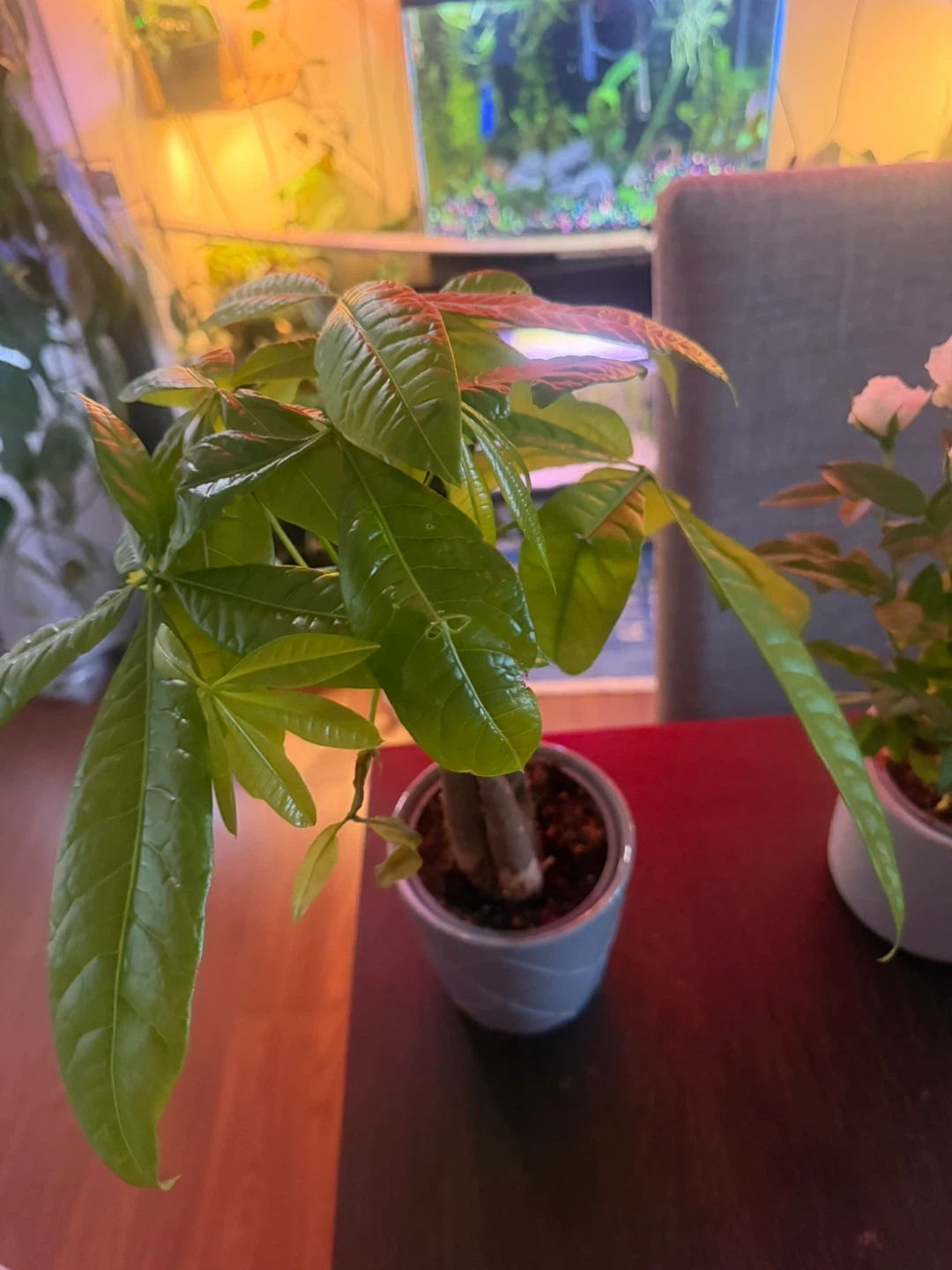 A healthy Money Tree plant in a light blue ceramic pot. This plant's braided trunk and lush green leaves make it a beautiful addition to any home.