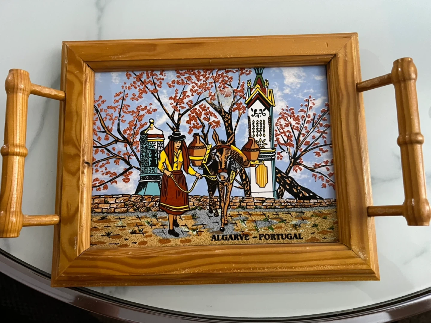 This decorative tray features a charming scene from Algarve, Portugal, with a woman and a donkey. It has a wooden frame and handles, perfect for displaying or light use. Wood construction.