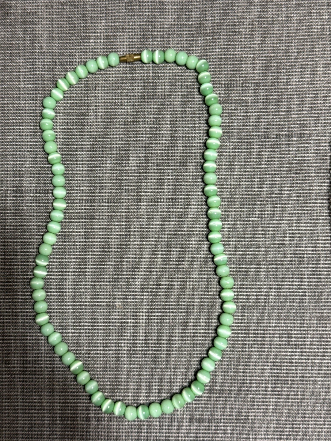This necklace features round, pale green beads with a subtle sheen. It's secured with a small, gold-toned clasp. The beads appear to be cat's eye stone or a similar material.
