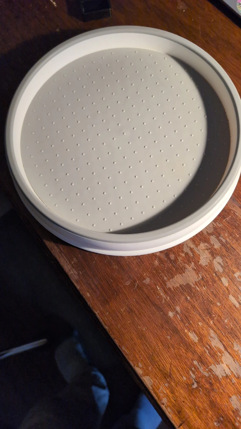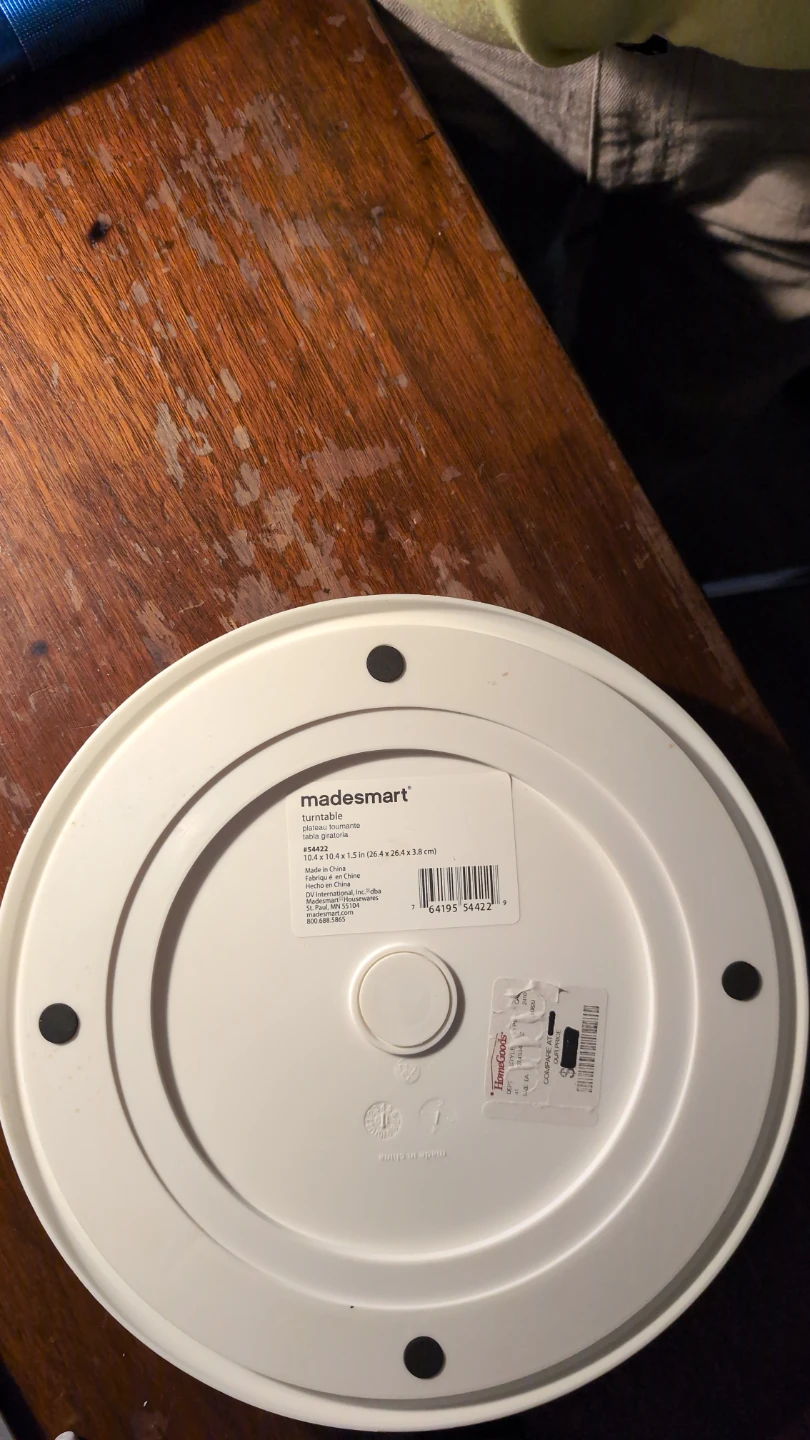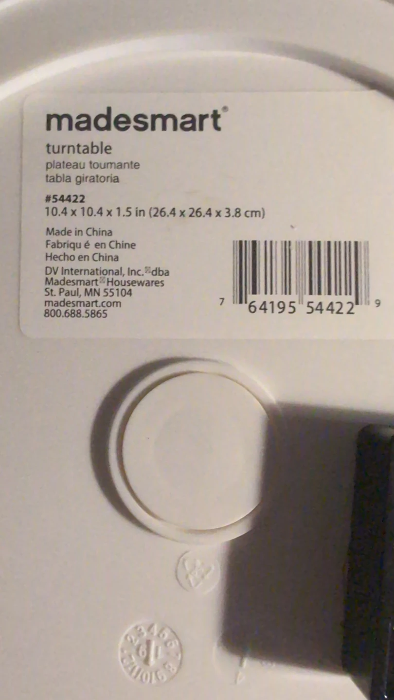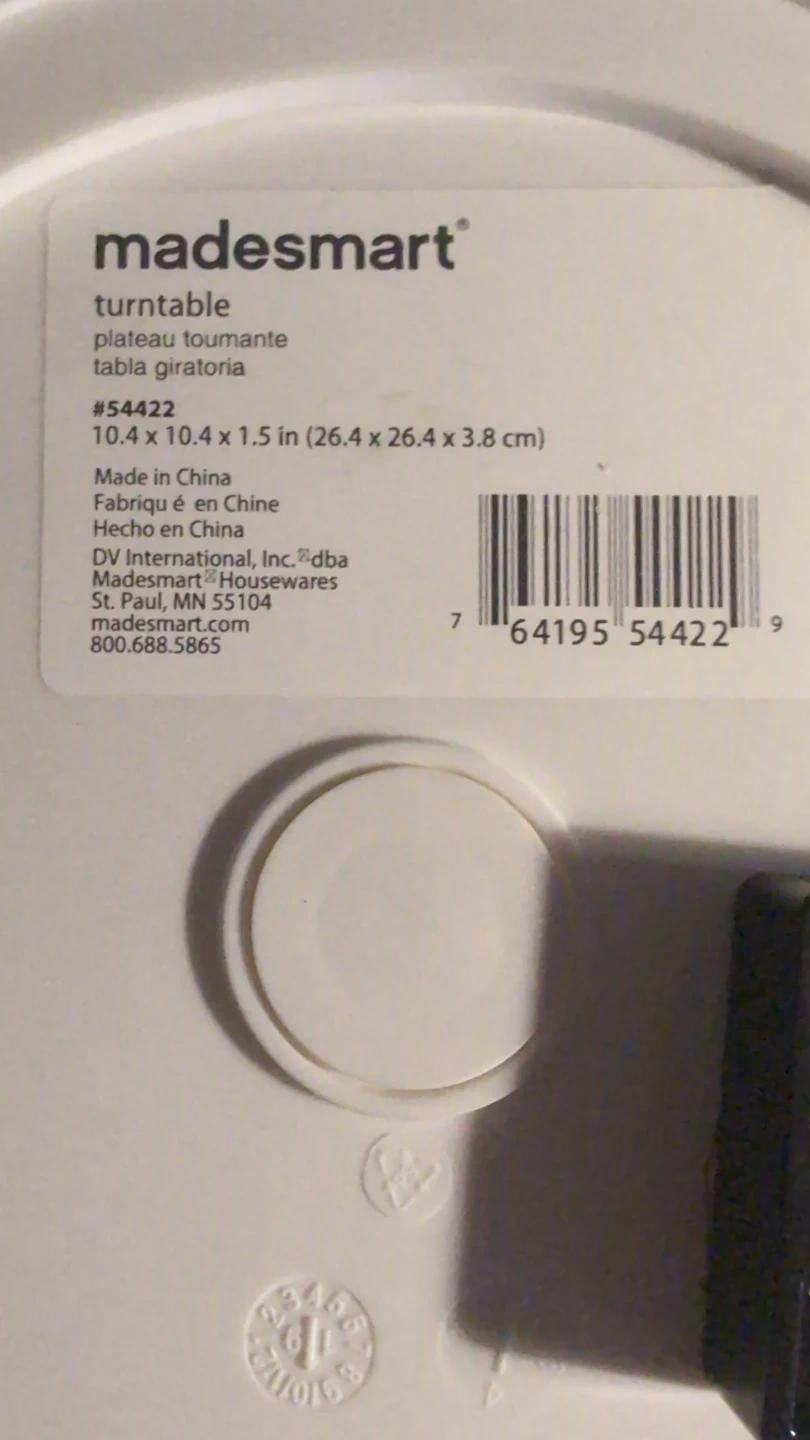 This is a Madesmart turntable. It measures 10.4 by 10.4 by 1.5 inches. The turntable has a white exterior with a gray non-slip surface inside.