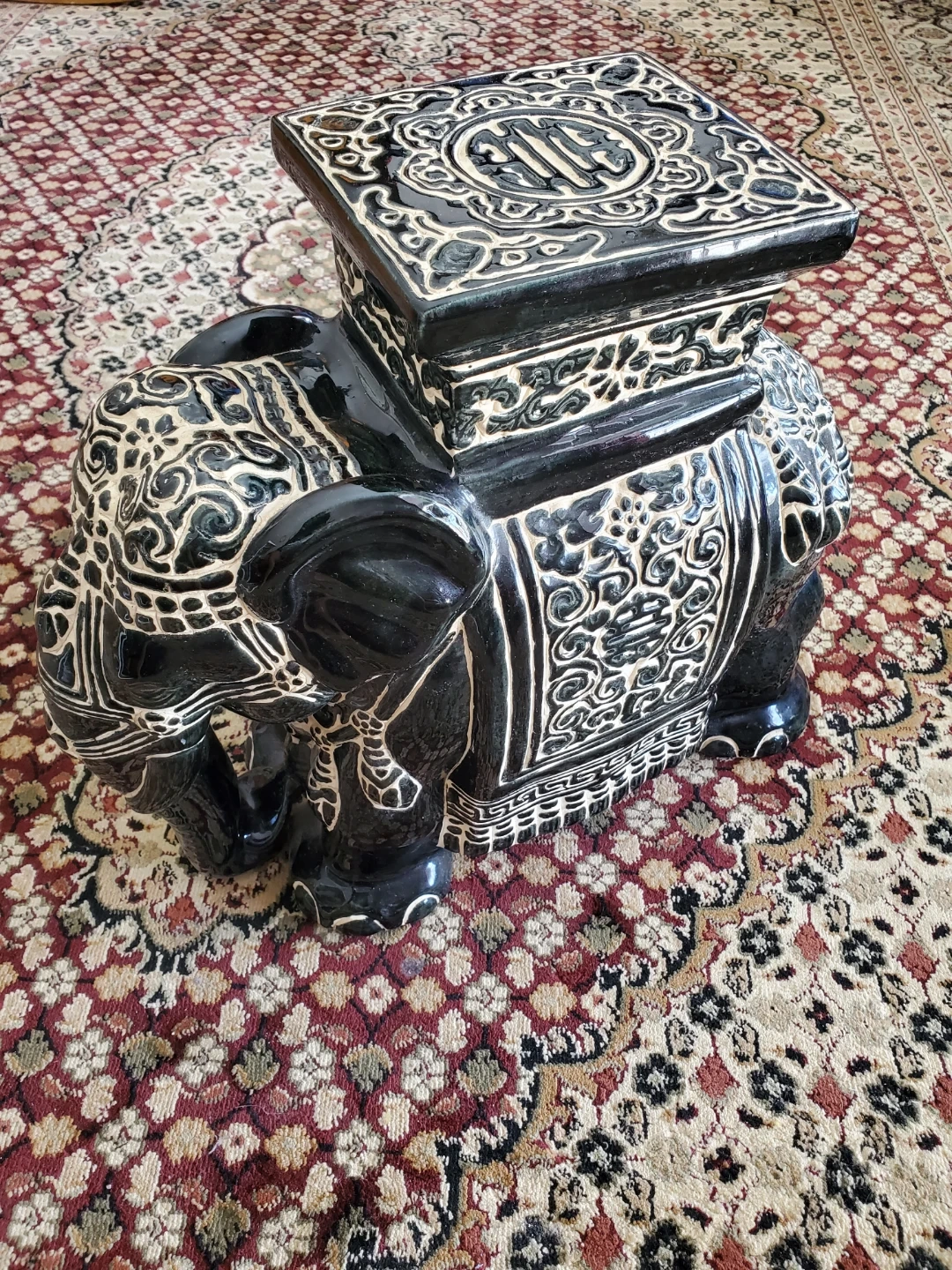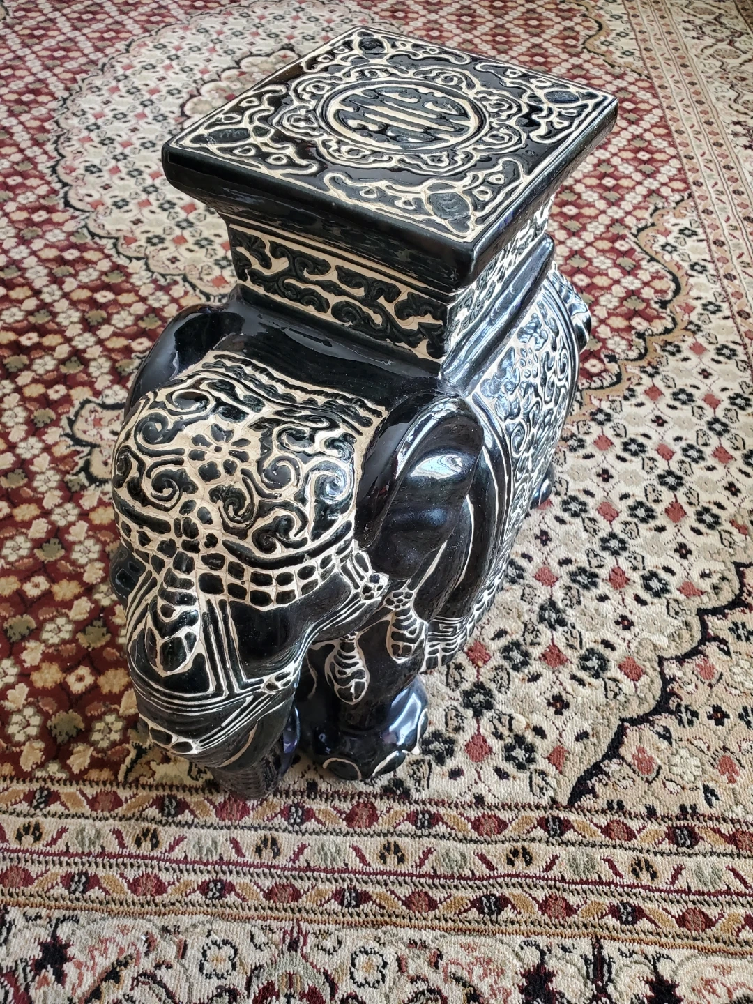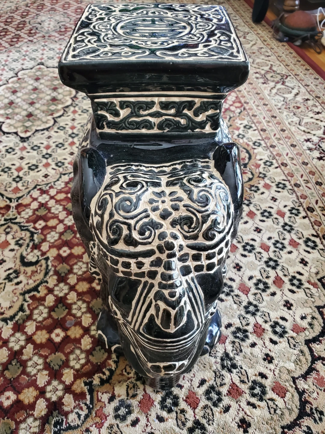 This is a decorative elephant garden stool. It's made of ceramic with intricate carved details. This stool adds a unique touch to any indoor or outdoor space. It's a substantial piece, perfect for a plant stand or a side table.