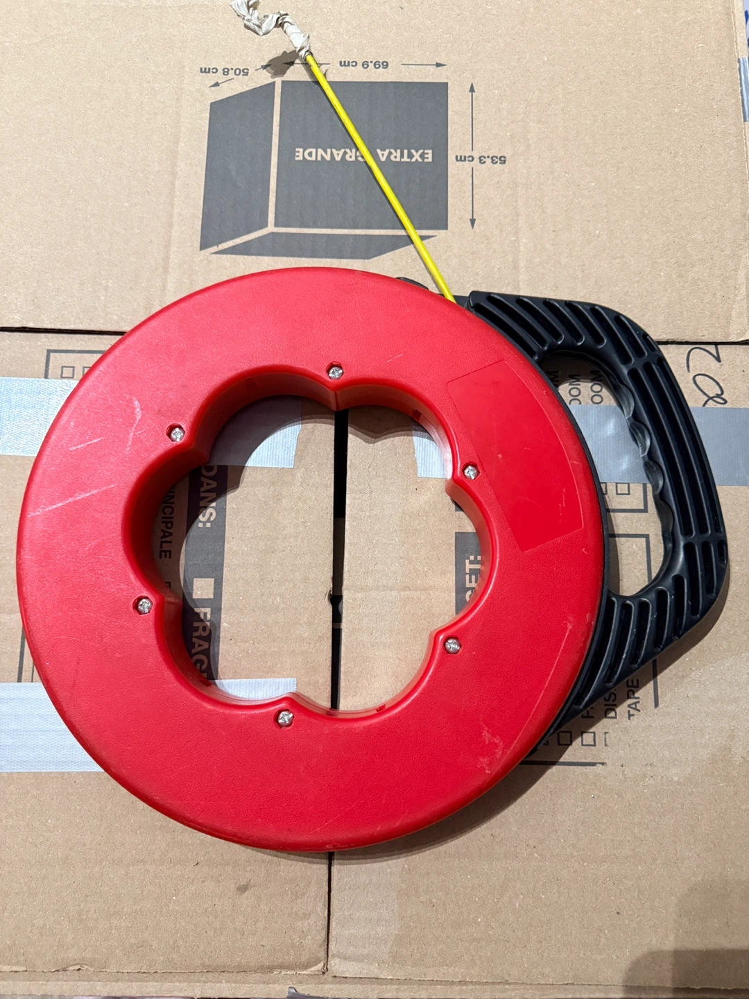 This fish tape puller has a red reel and a black handle. The tape itself is yellow. It's great for running wires through conduit and tight spaces!