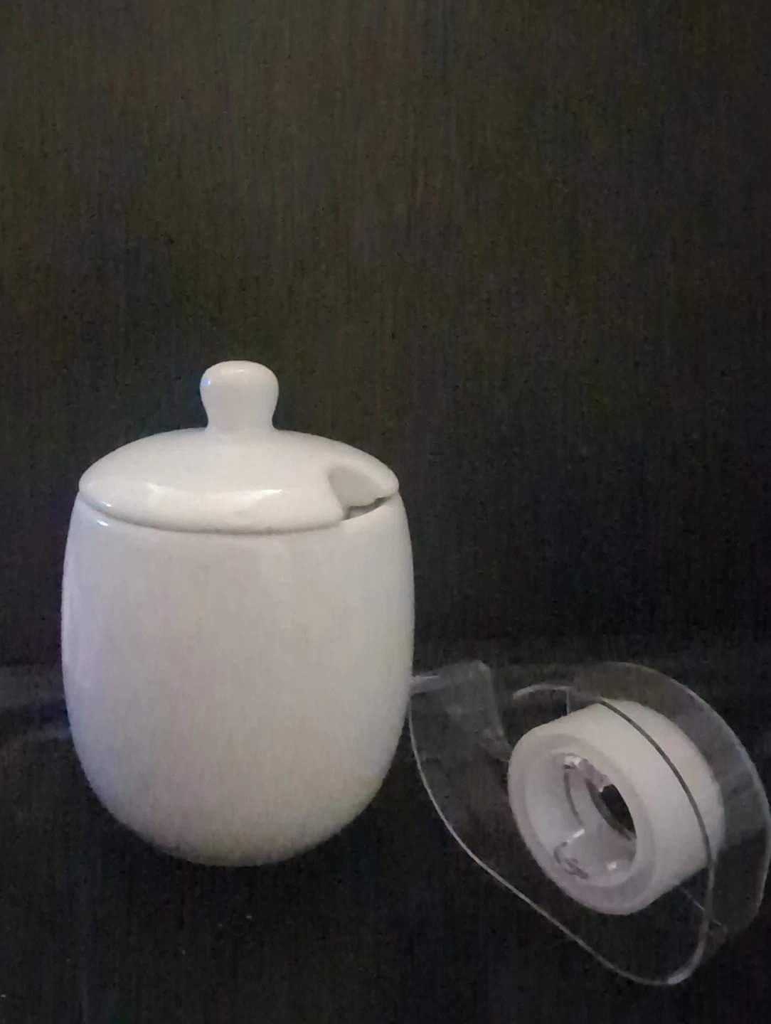 Selling a cute white ceramic sugar bowl with a lid. Perfect for adding a touch of charm to your kitchen or dining table! Tape for size reference, missing the little spoon
