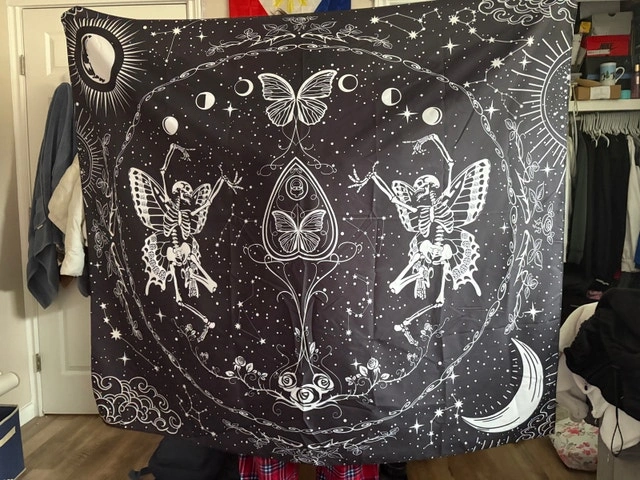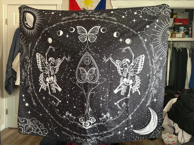 Add a touch of mystical charm to your space with this black and white tapestry featuring celestial skeletons and butterfly motifs. It's in great condition and ready to hang, perfect for adding a unique vibe to any room. If this ad is still up, rest assured, it's still available! Cash accepted.
