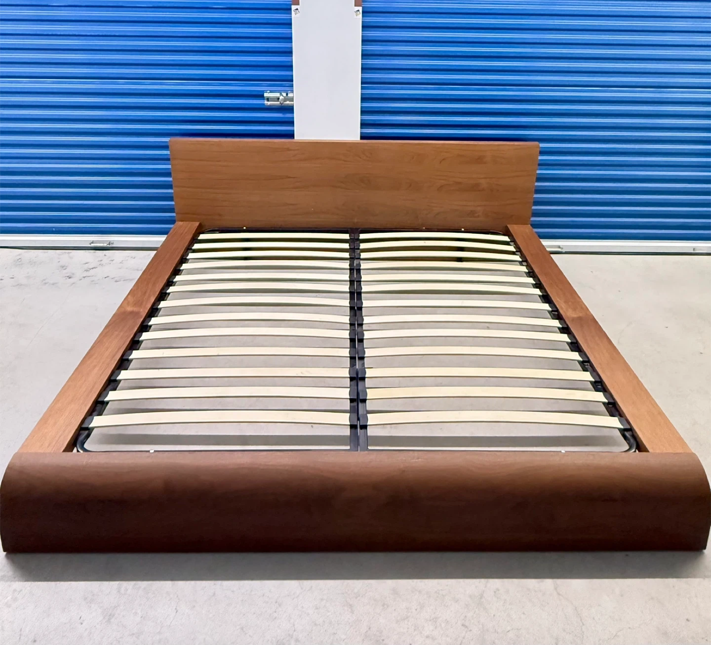 This is a wooden platform bed frame featuring a modern design with a curved footboard and a simple headboard. It includes a slatted support system for your mattress. The wood finish is a warm, natural tone.