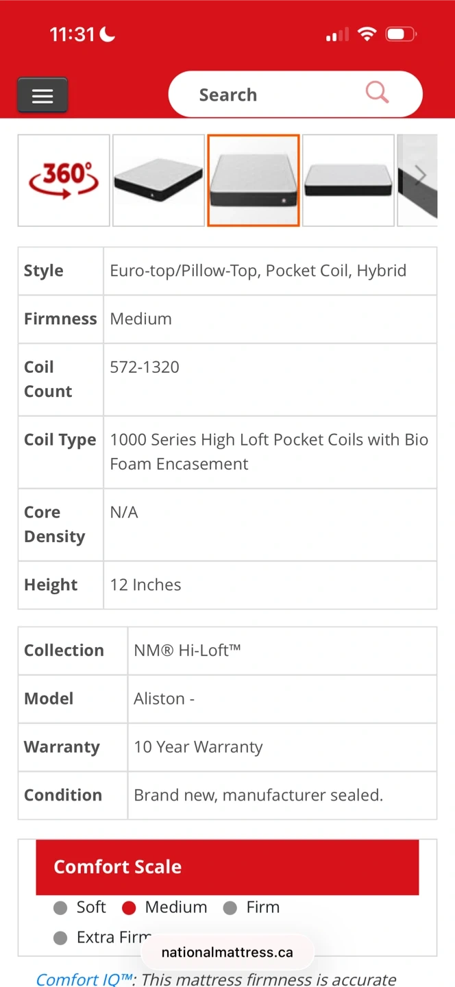 This NM Aliston mattress features a Euro-top/Pillow-top style with pocket coils and a hybrid construction. It's 12 inches high and offers a medium firm feel. The mattress is made with polyurethane foam and white cotton felt.