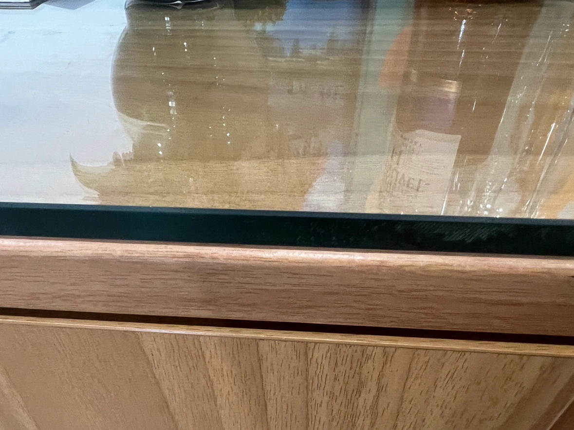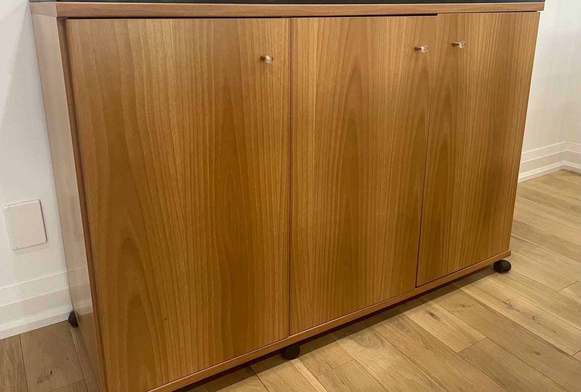 Neo Set 3 door cabinet with shelving and protective glass on top. Perfect for a dining room side board, Tv console or cabinet in bedroom, office, or entry way. The cabinet is also very sturdy and conveniently on wheels which makes it incredibly easy to move from room to room!