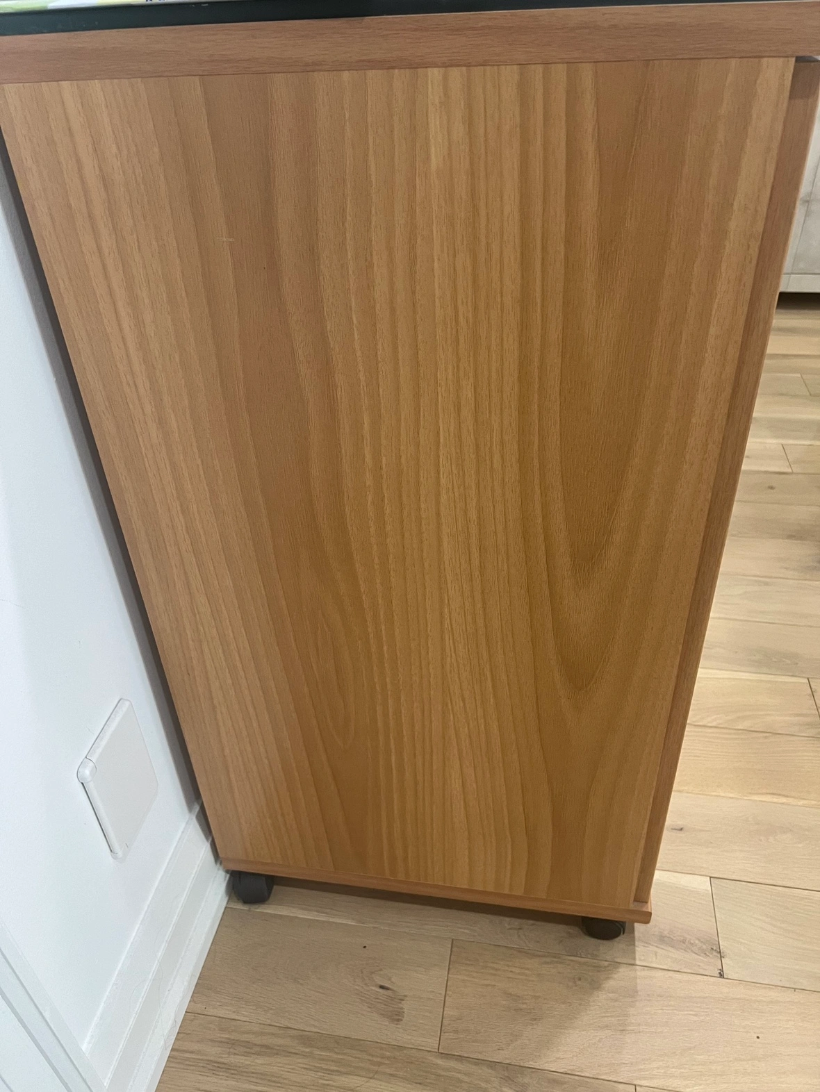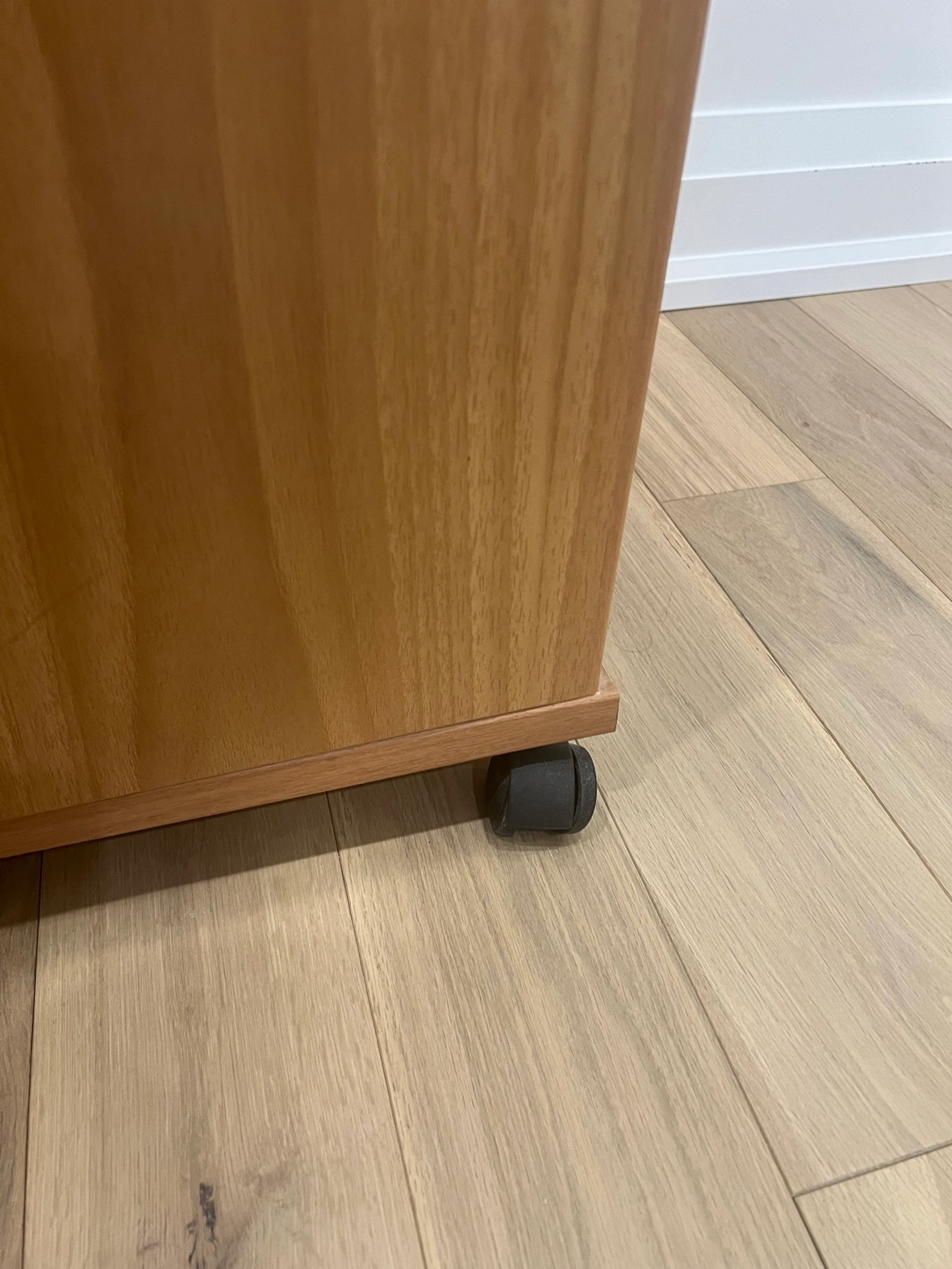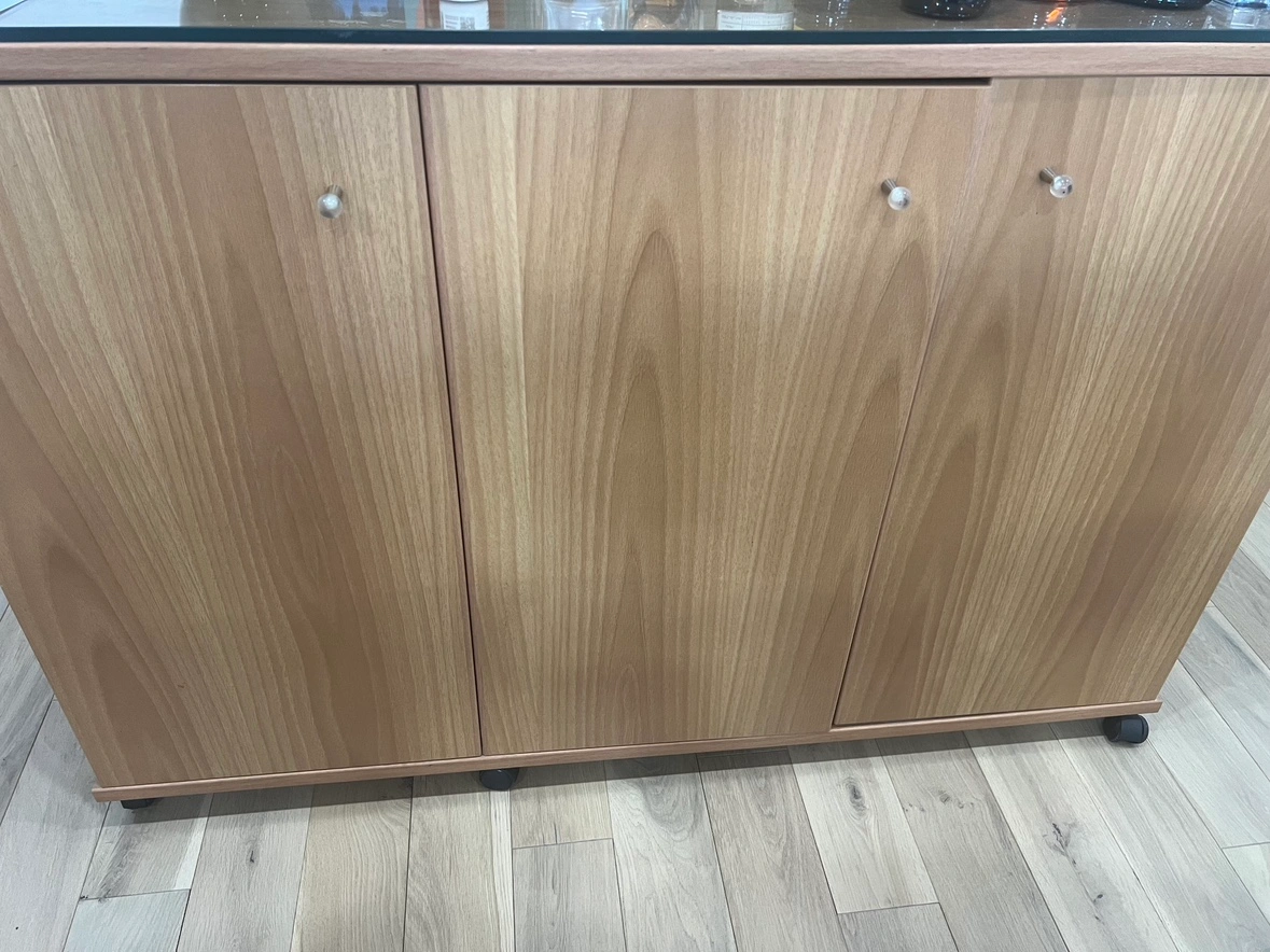 Neo Set 3 door cabinet with shelving and protective glass on top. Perfect for a dining room side board, Tv console or cabinet in bedroom, office, or entry way. The cabinet is also very sturdy and conveniently on wheels which makes it incredibly easy to move from room to room!