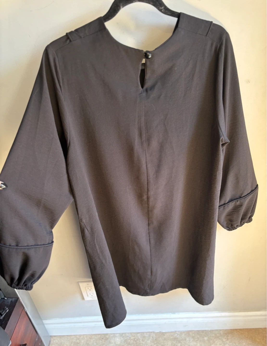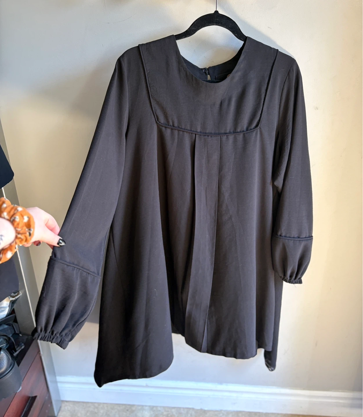 Has a square neckline and long balloon sleeves